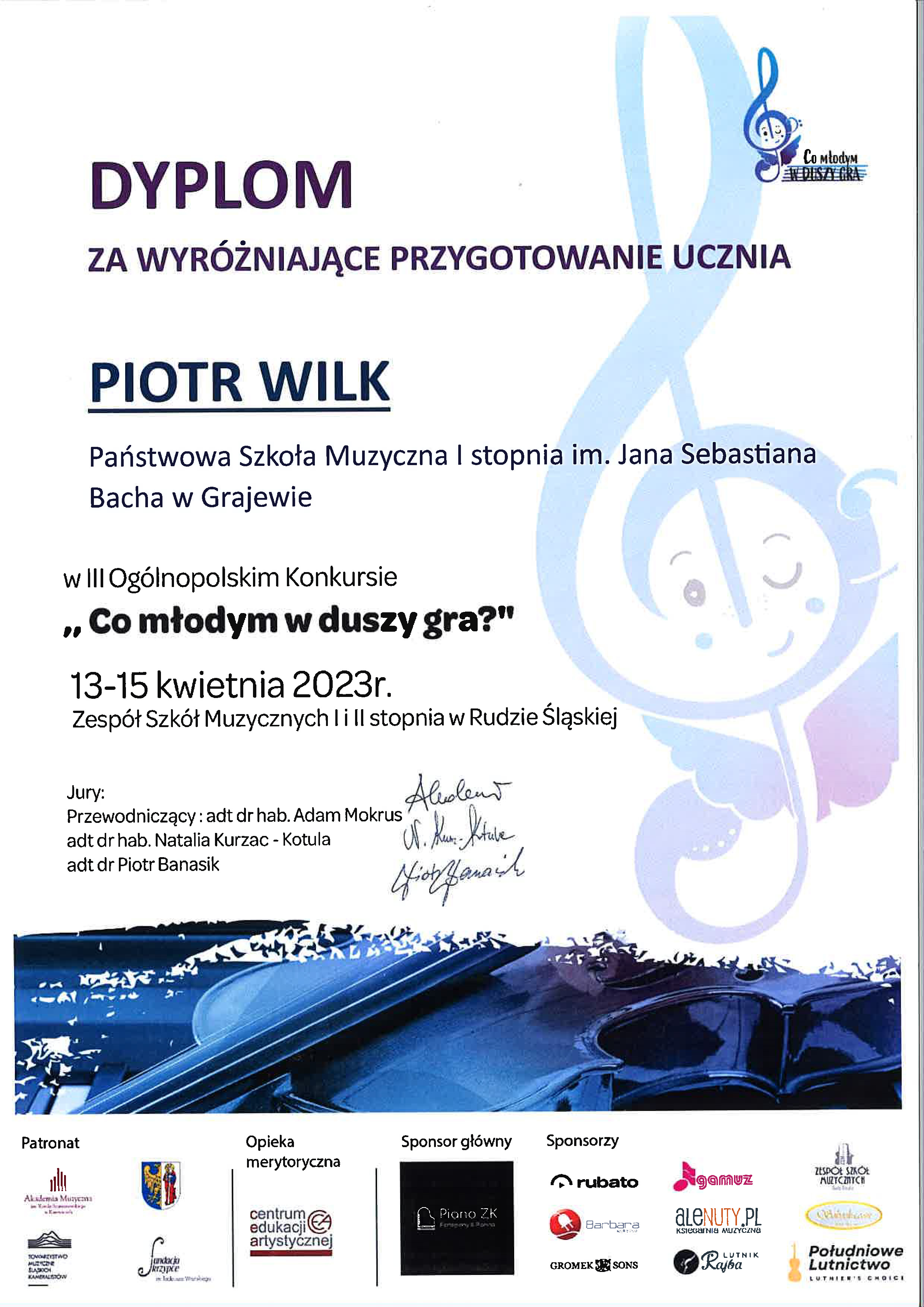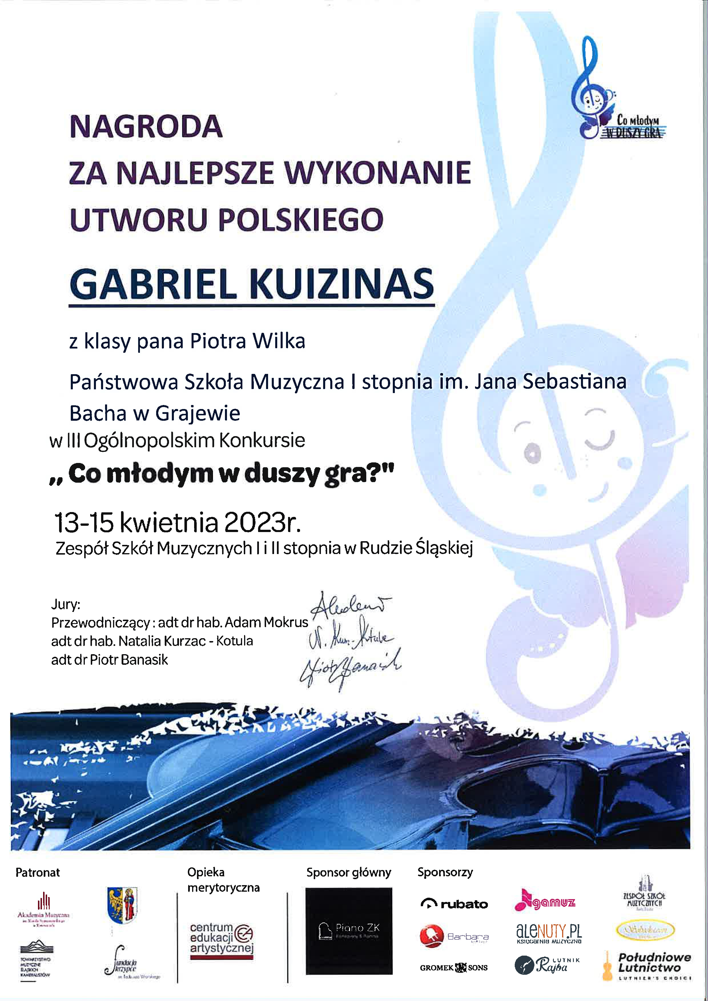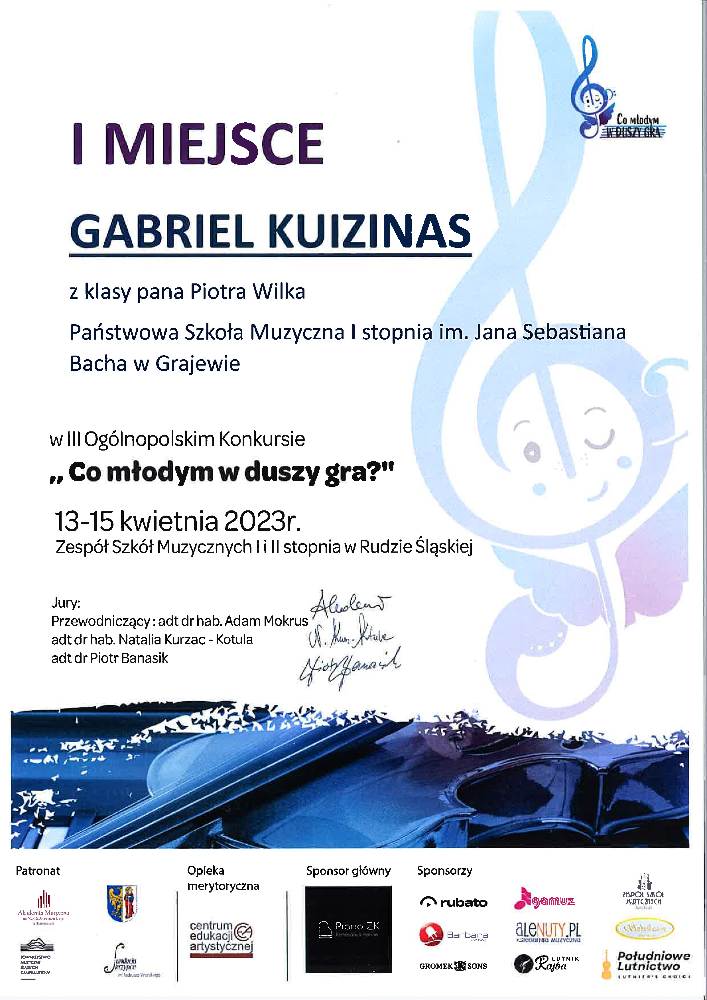 Gabrysiowi składamy wielkie gratulacje i życzymy dużo wytrwałości w tej jakże pięknej przygodzie muzycznej oraz dalszych sukcesów.