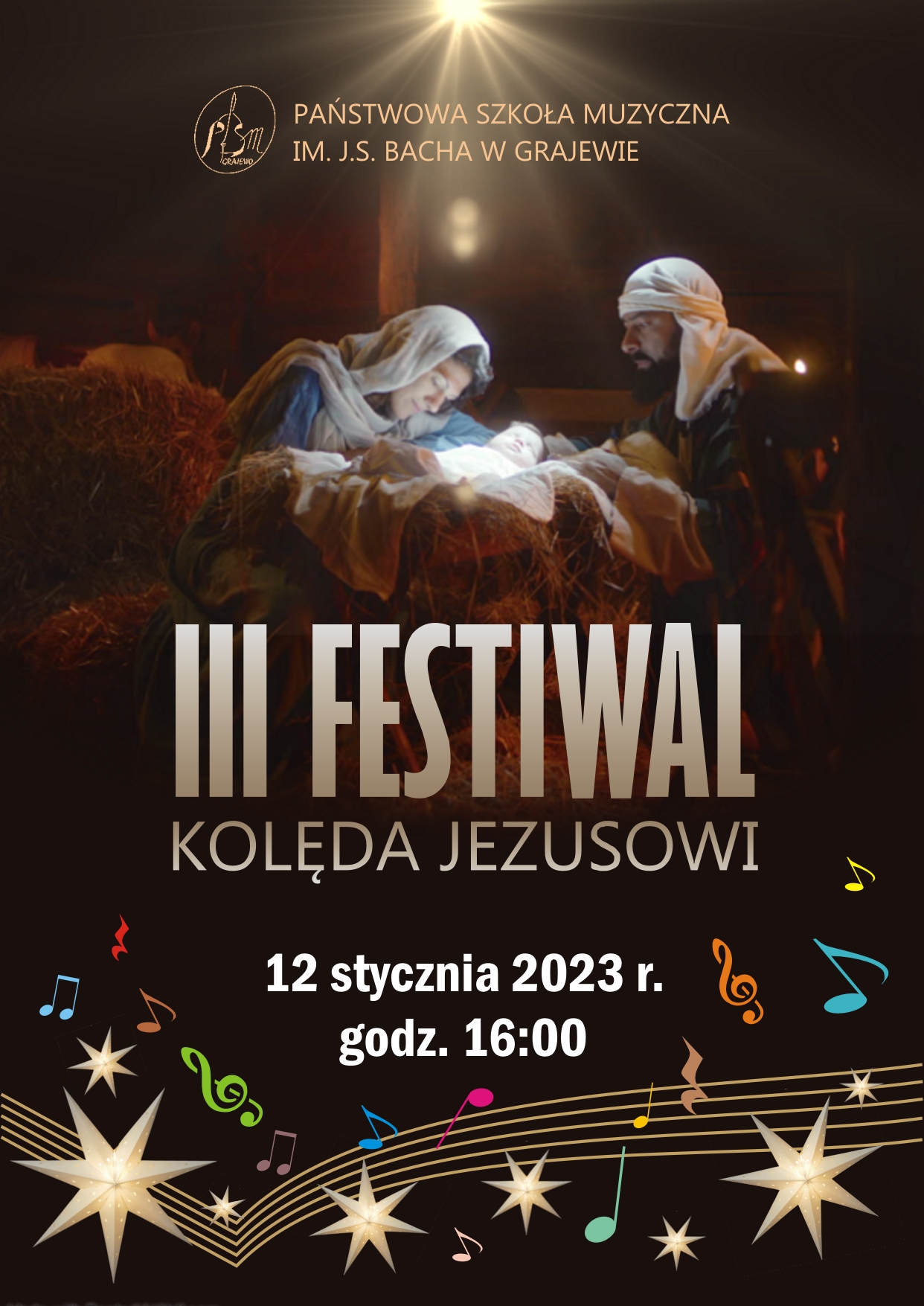 Serdecznie zapraszamy do udziału w III Szkolnym Festiwalu " Kolęda Jezusowi" który odbędzie się w tym roku w formie stacjonarnej 12 stycznia 2023 roku na Auli PSM I st im. J. S. Bacha w Grajewie. Zgłoszenia przyjmujemy do 6 stycznia w formie elektronicznej pod adresem: urszula.wlazniak@psmgrajewo.pl.