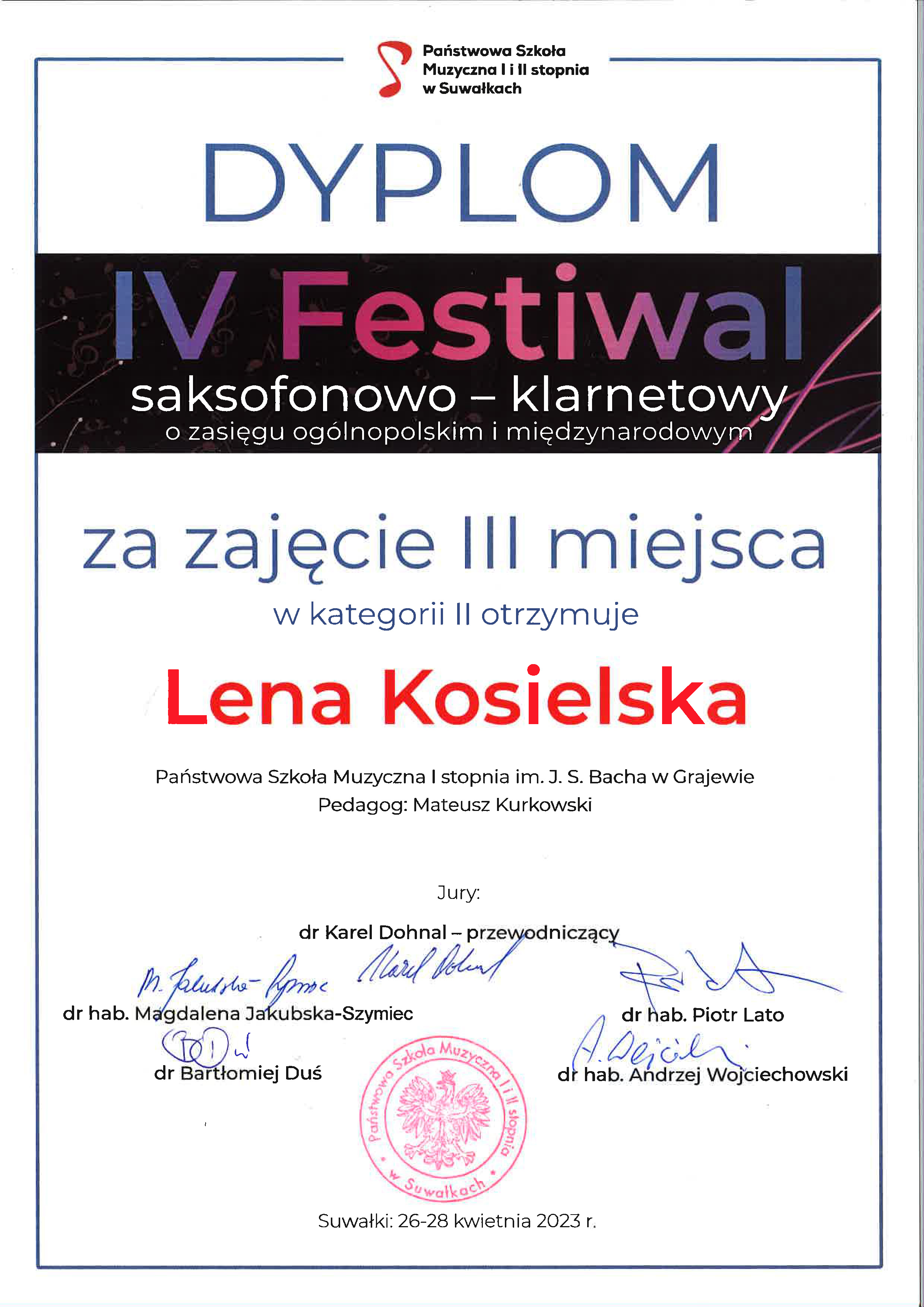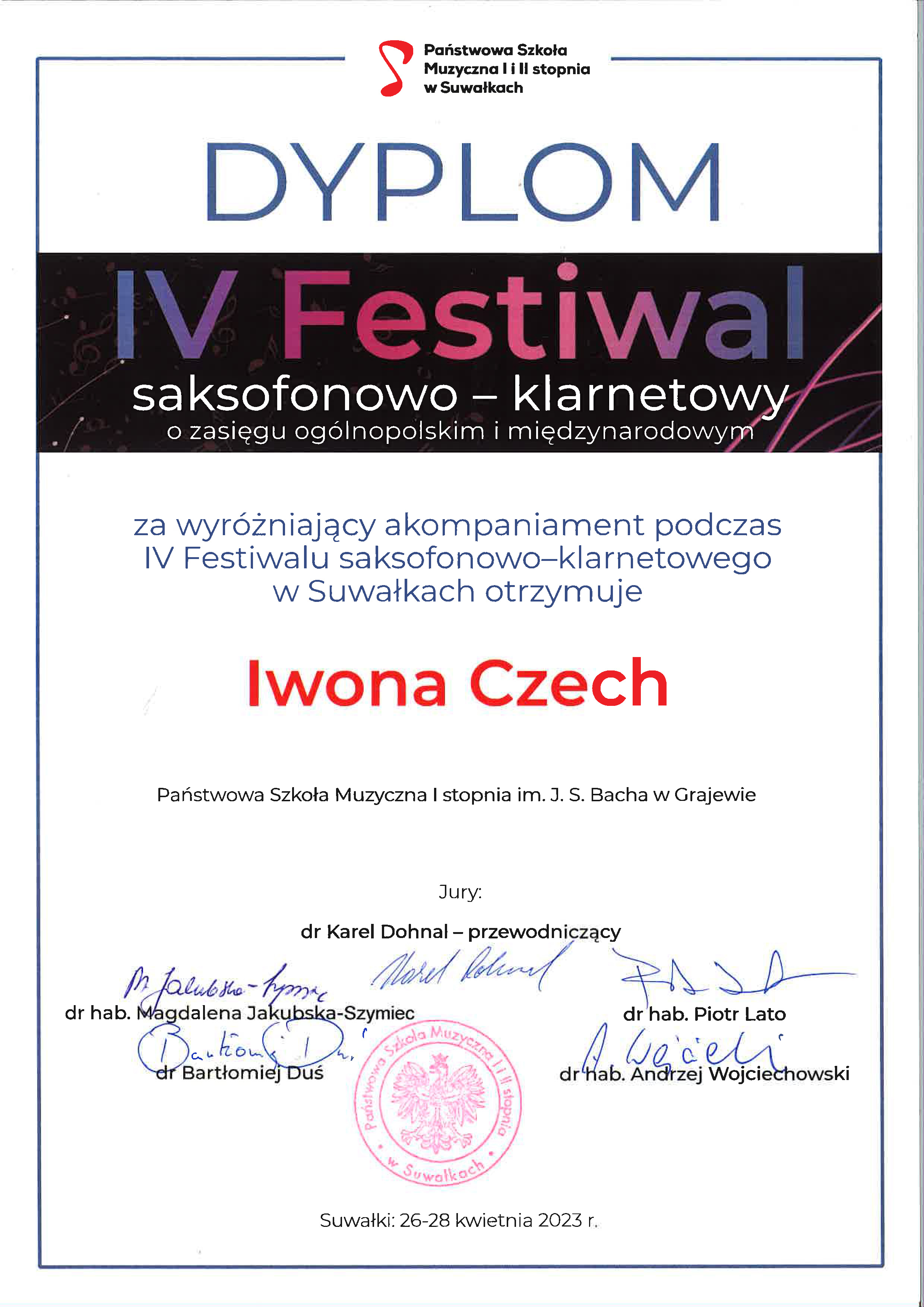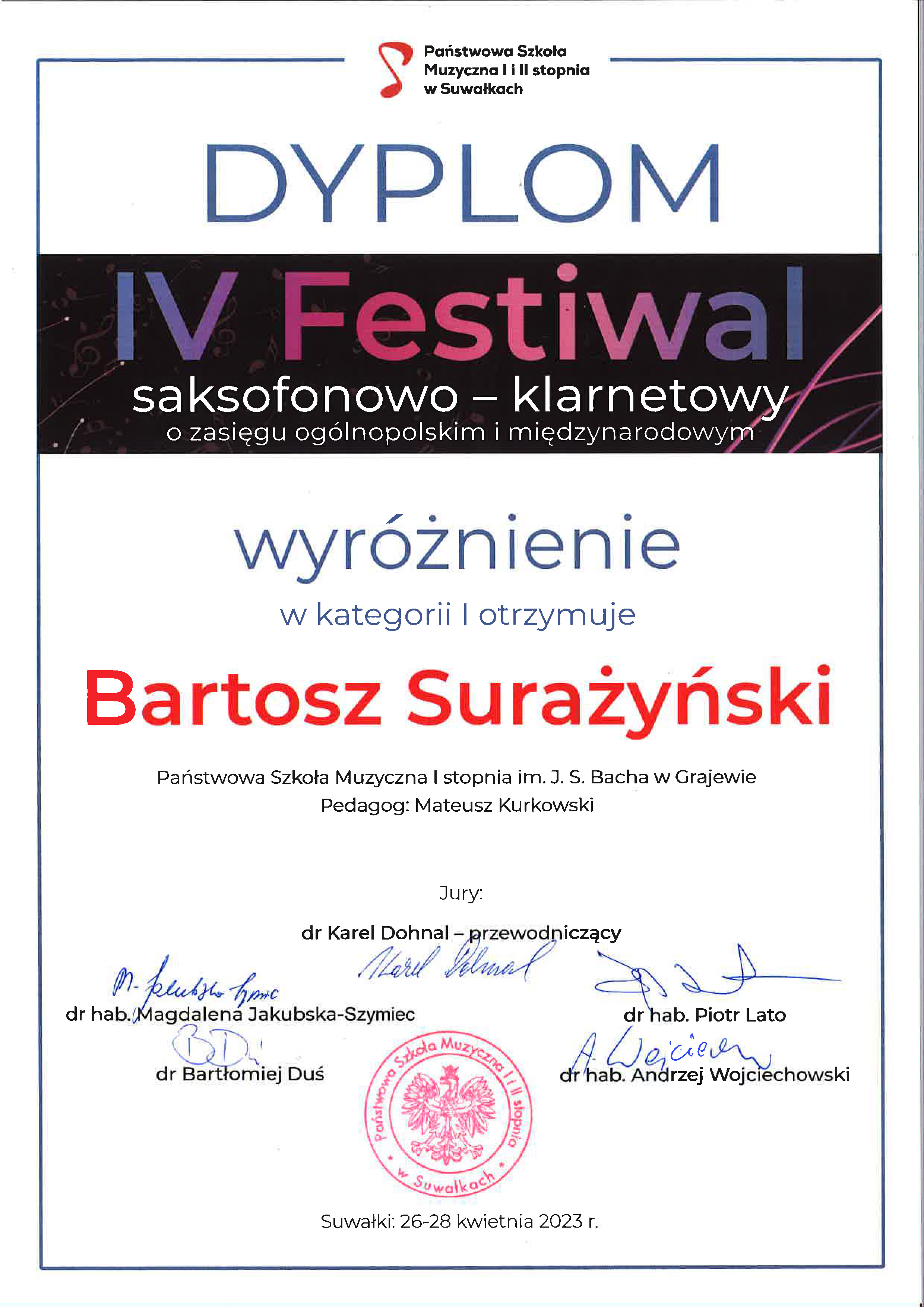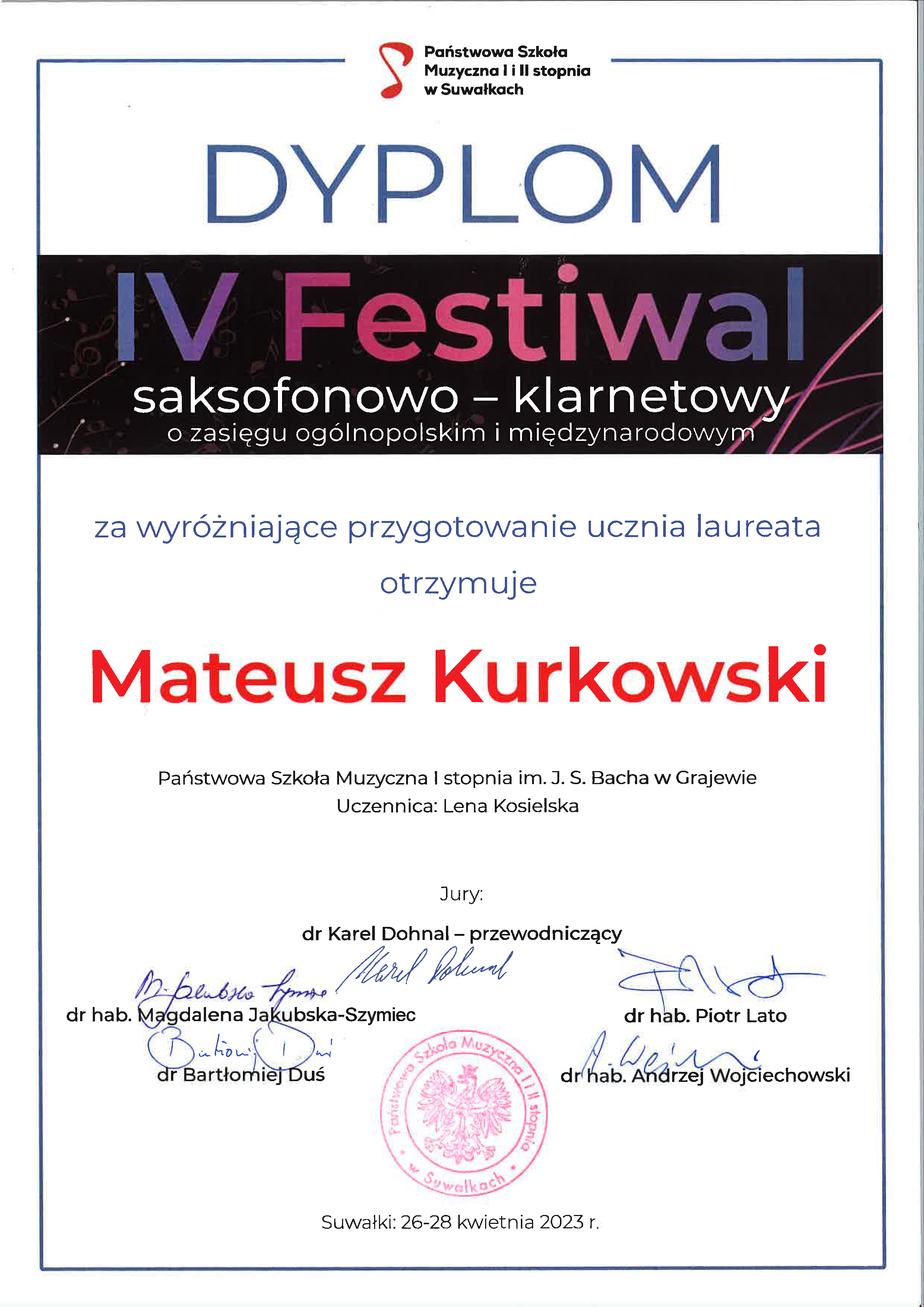 26 kwietnia 2023 odbył się IV Festiwal saksofonowo-klarnetowy w Suwałkach, w którym udział brali uczniowie naszej szkoły. Festiwal ma na celu zbliżenie młodych artystów z wielkimi autorytetami świata kultury, ukazywanie młodym adeptom sztuki drogi do mistrzostwa oraz stworzenie przestrzeni do spotkań środowiska muzycznego klarnecistów oraz saksofonistów: uczniów, pedagogów, artystów oraz miłośników muzyki klarnetowej i saksofonowej.