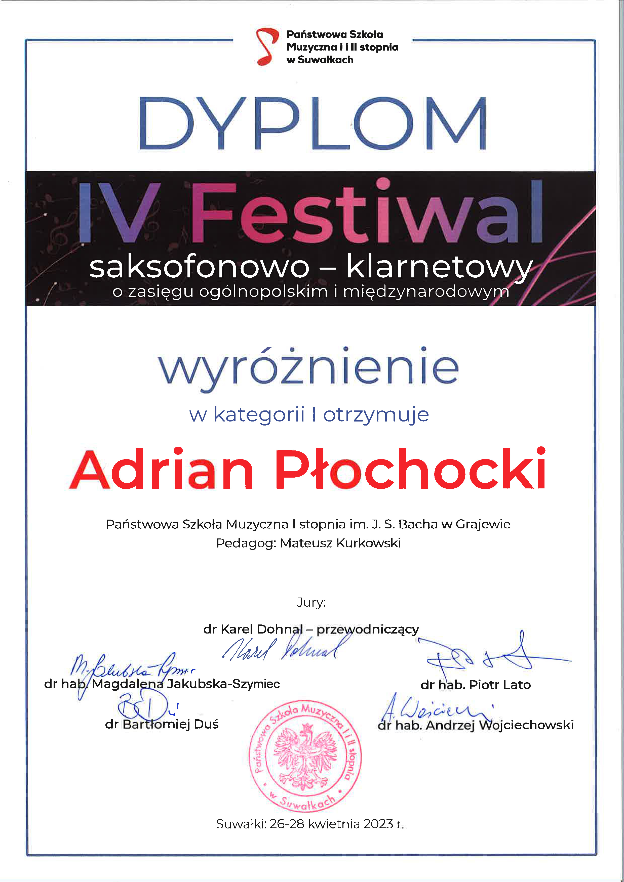 ADRIAN PŁOCHOCKI (saksofon) - wyróżnienie