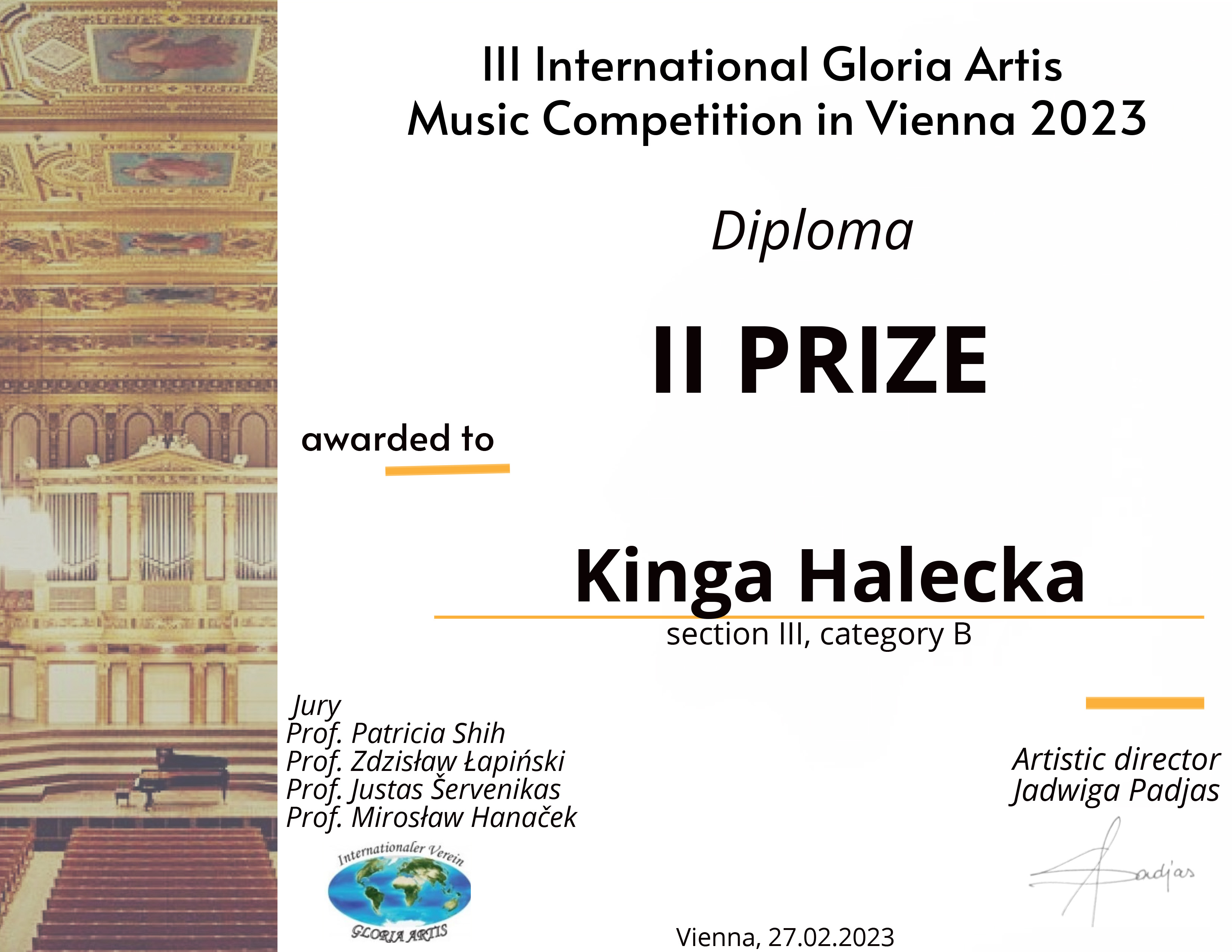 Kinga Halecka z klasy wiolonczeli p. Urszuli Właźniak zdobyła II Nagrodę w III Międzynarodowym Konkursie "Gloria Artis" w Wiedniu (Austria), który odbył się 27 lutego 2023 roku. Wiolonczelistce akompaniował p. Piotr Wilk