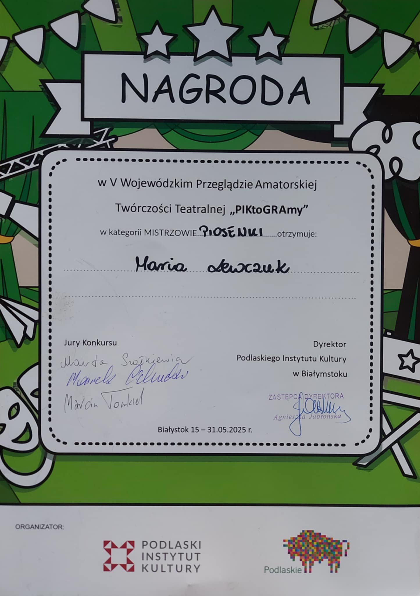 Maria Lewczuk - Nagroda w Wojewódzkim Przeglądzie Amatorskiej Twórczość Teatralnej "PIKtoGRAmy" -15-31.05.2025 Białystok