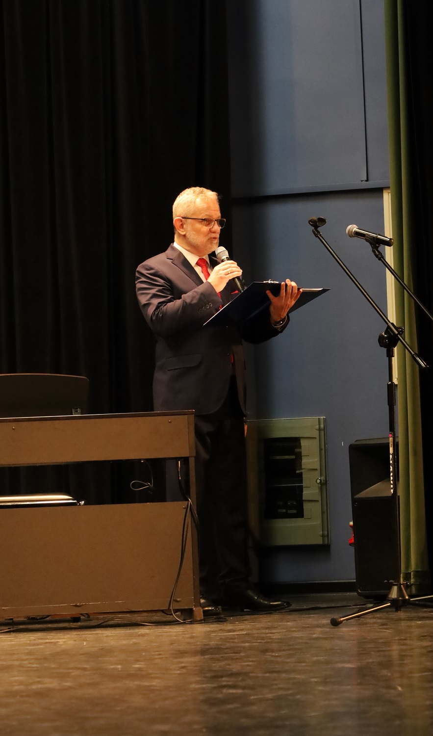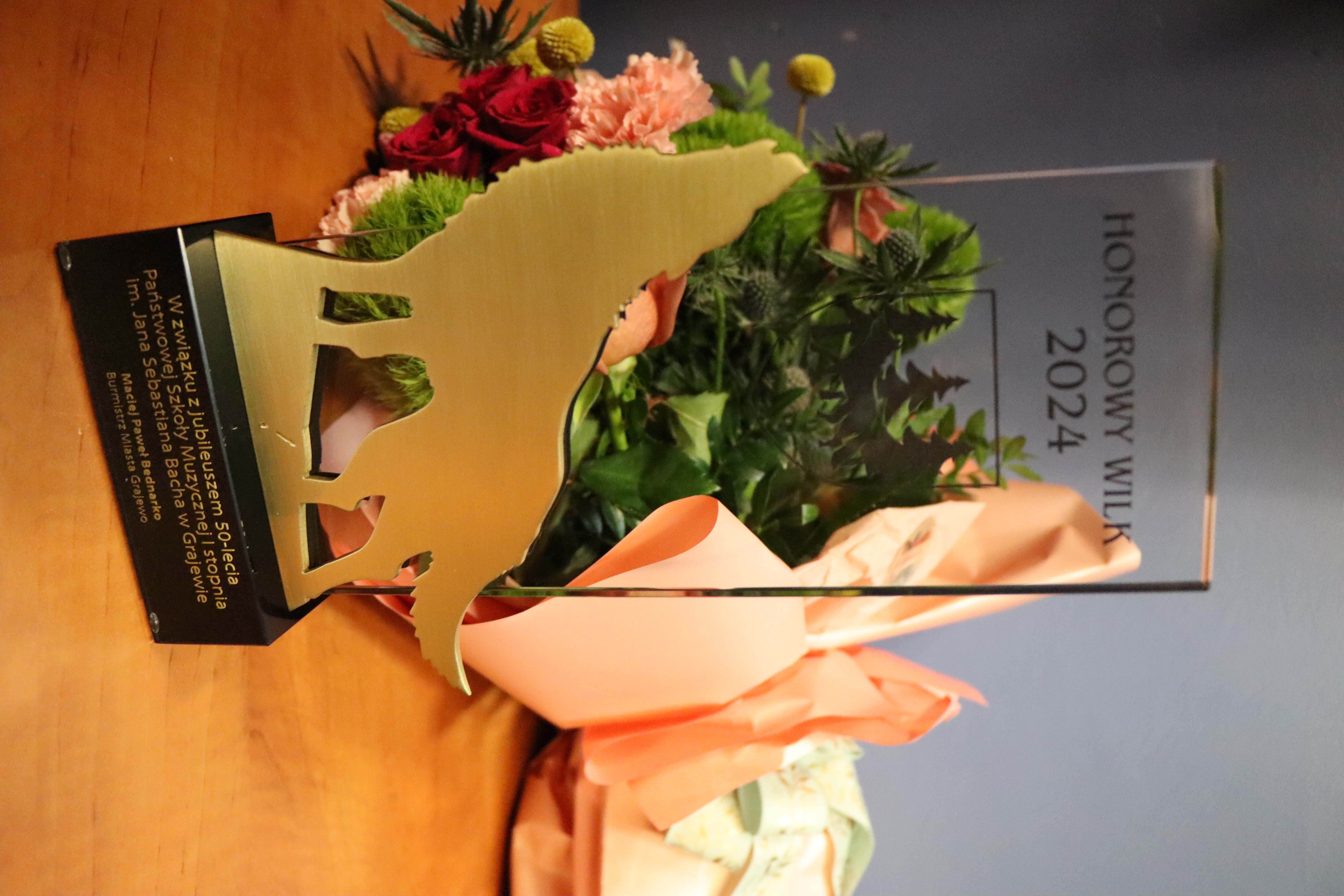 W trakcie koncertu Burmistrz wraz ze Starostą pogratulowali dyrektor Państwowej Szkoły Muzycznej p. Agacie Świderskiej znakomicie przygotowanego programu uroczystości i podziękowali za współpracę z jednostkami samorządowymi. Z rąk Macieja Pawła Bednarko p. Dyrektor otrzymała statuetkę Honorowego Wilka Roku 2024 z racji niedawno obchodzonego Jubileuszu 50-lecia szkoły.