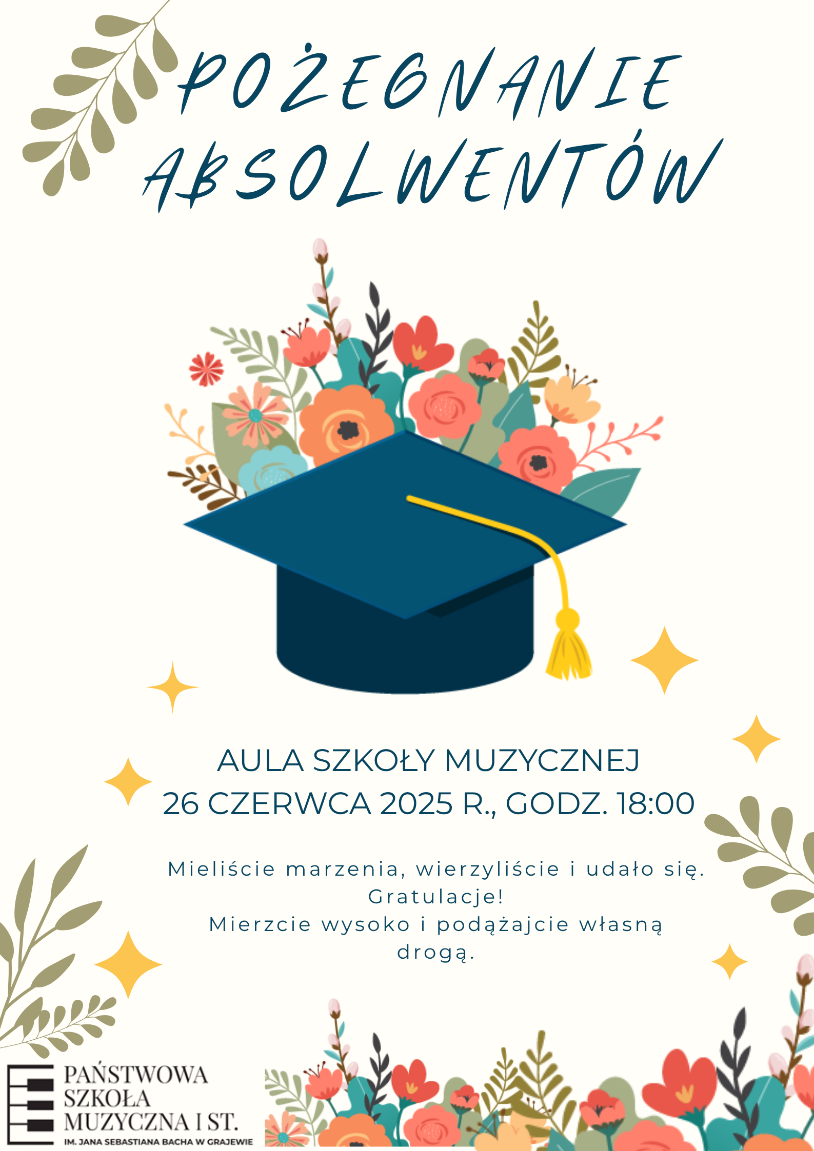 Serdecznie zapraszamy tegorocznych Absolwentów wraz z rodzicami i nauczycielami na uroczystość zakończenia roku, która odbędzie się w czwartek, 26 czerwca o godzinie 18:00 w Auli Szkoły Muzycznej.