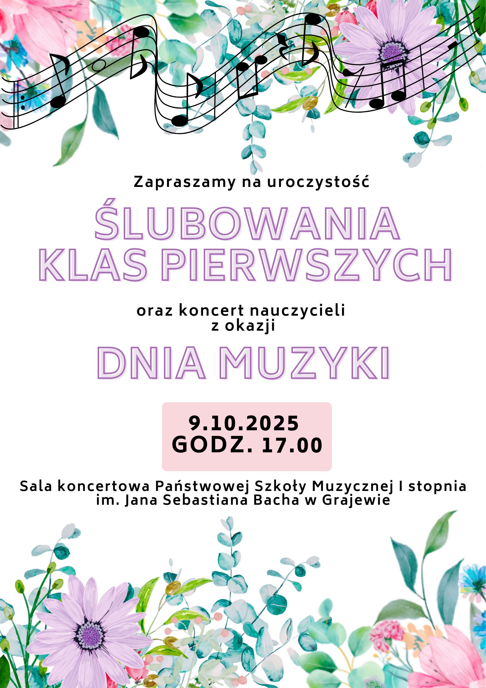 Państwowa Szkoła Muzyczna I stopnia im. Jana Sebastiana Bacha ma zaszczyt zaprosić Rodziców, Uczniów oraz Przyjaciół Szkoły na uroczystość ŚLUBOWANIA KLAS PIERWSZYCH połączoną z koncertem nauczycieli z okazji Międzynarodowego Dnia Muzyki.
