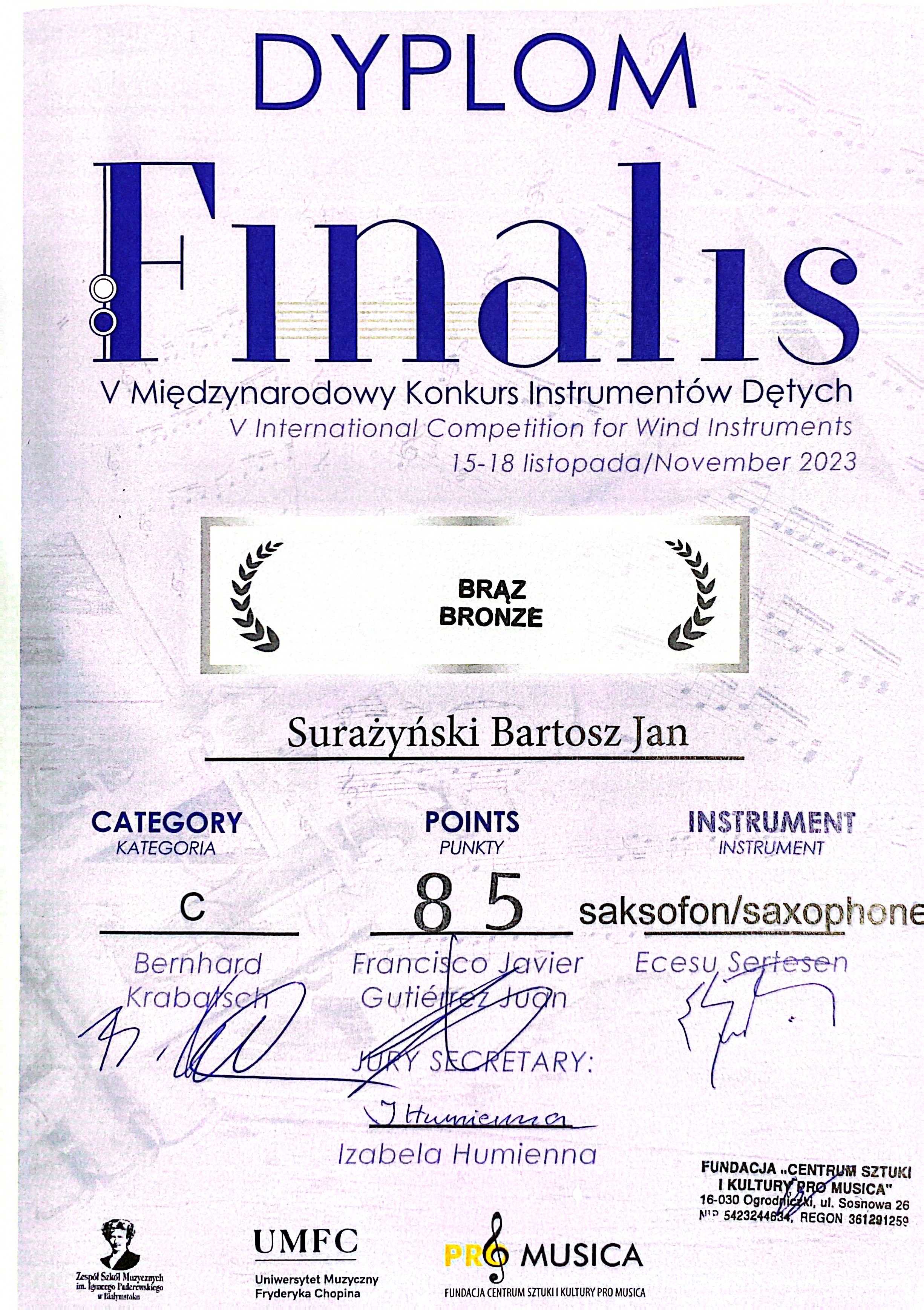 BARTOSZ SURAŻYŃSKI kl.2/c4 (saksofon) - Nagroda brązowa
