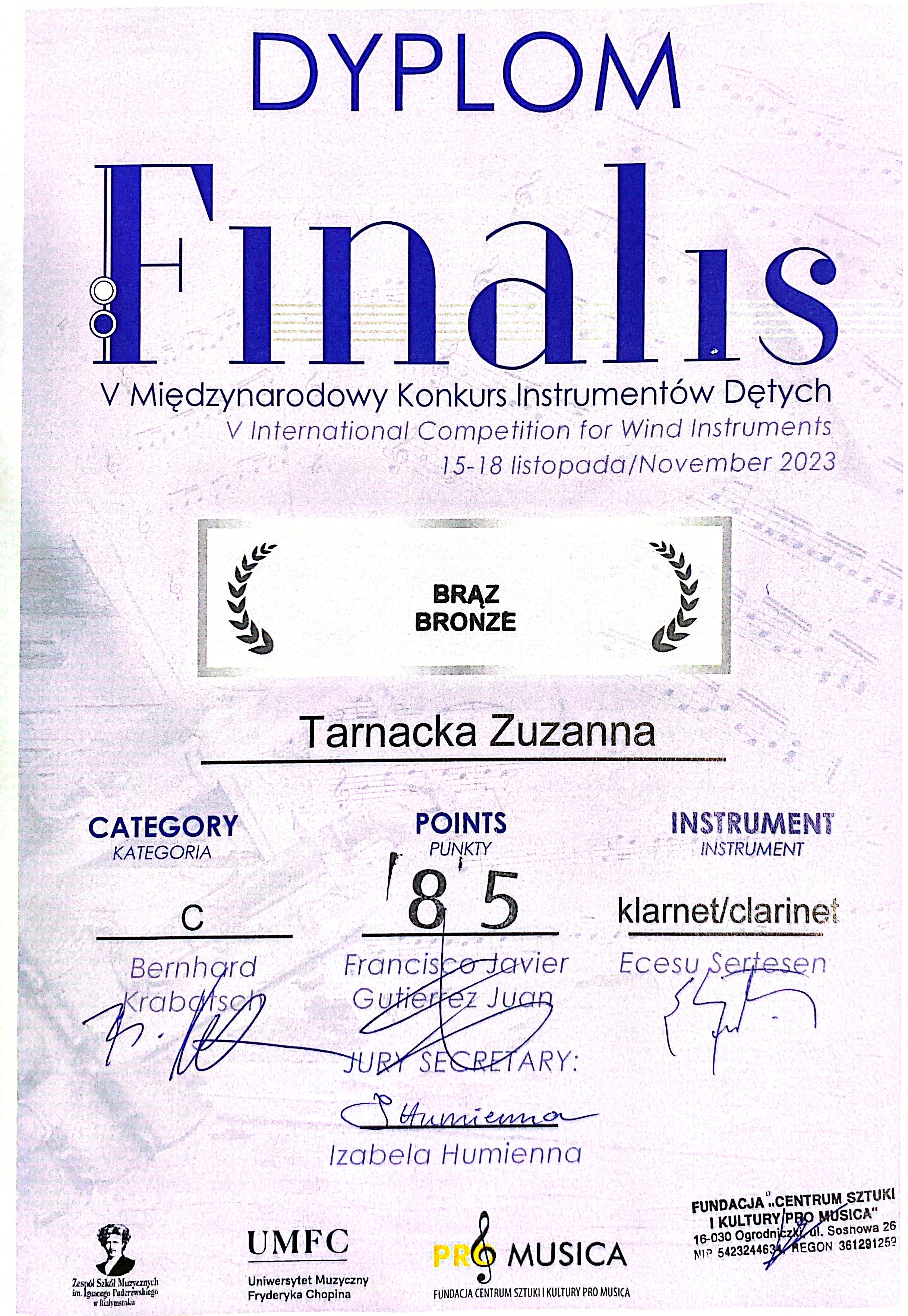 ZUZANNA TARNACKA kl.4/c4 (klarnet) - Nagroda brązowa