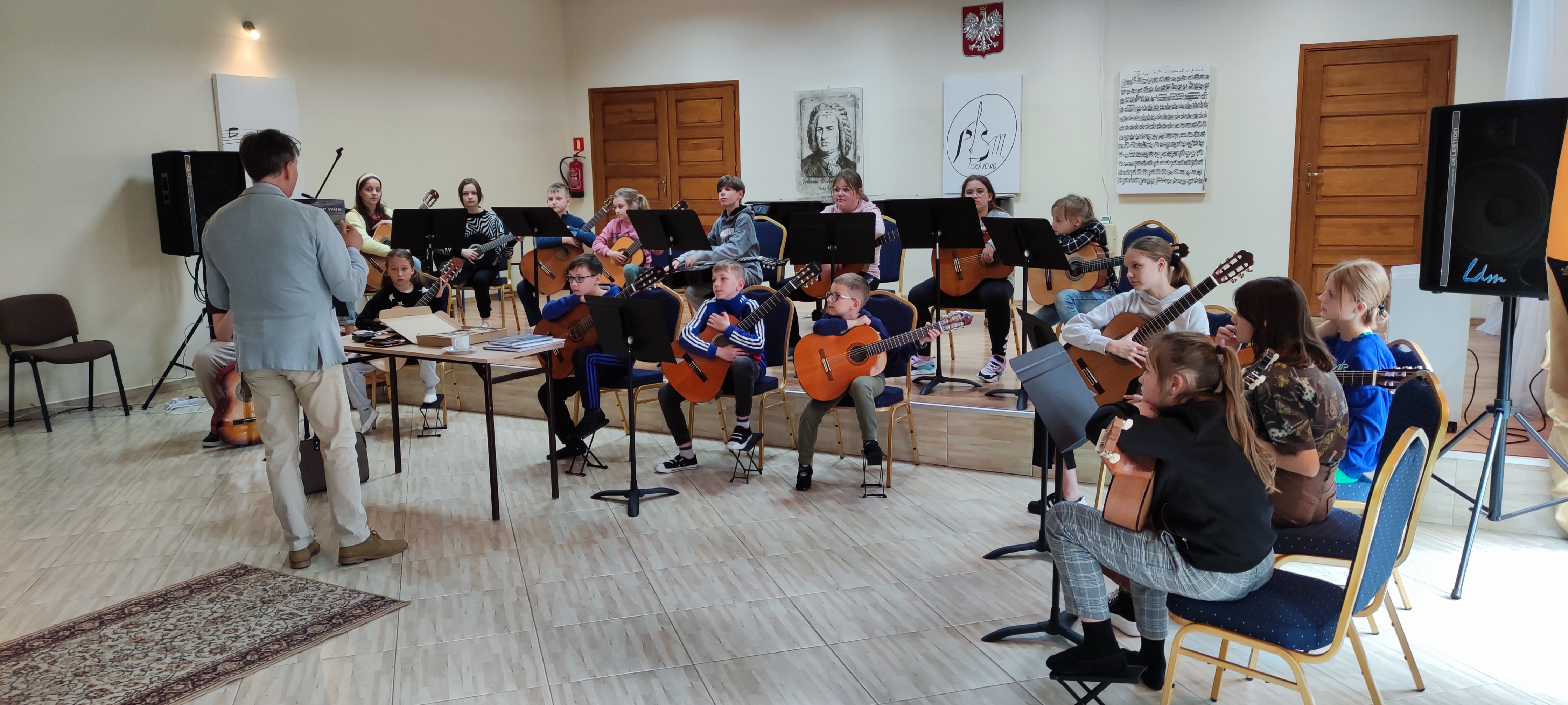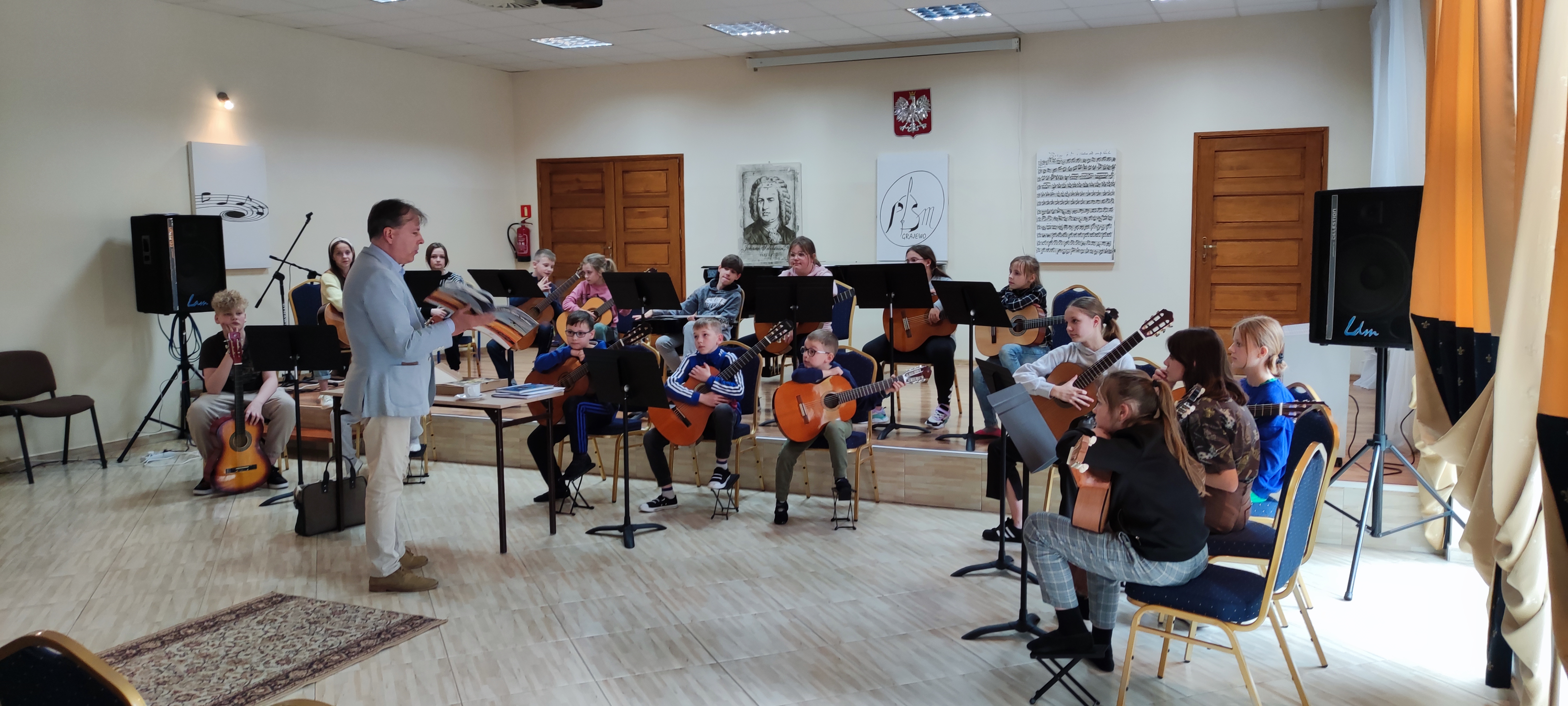 Zajęcia poprowadził pan Wojciech Popielarz-muzyk, gitarzysta, kompozytor. Skutecznie zachęcał uczniów klasy gitary do odkrywania kreatywności w grze na gitarze co przełożyło się na wykonanie przez wszystkich utworu skomponowanego podczas prezentacji.