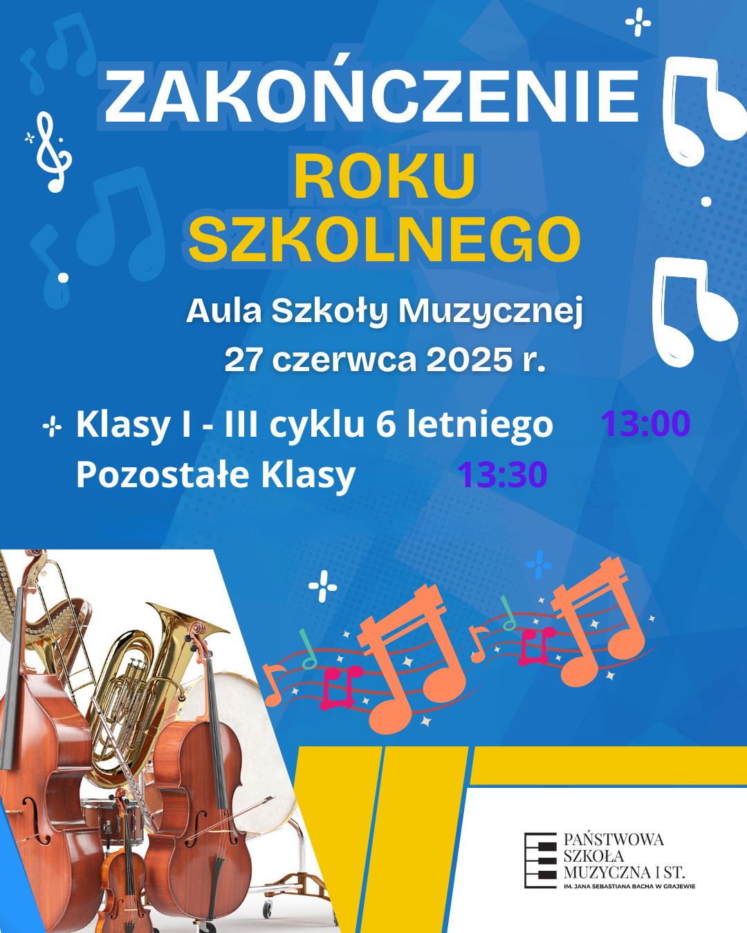 Serdecznie zapraszamy na uroczystość zakończenia roku szkolnego, która odbędzie się 27 czerwca 2025 r,. w Auli Szkoły Muzycznej.