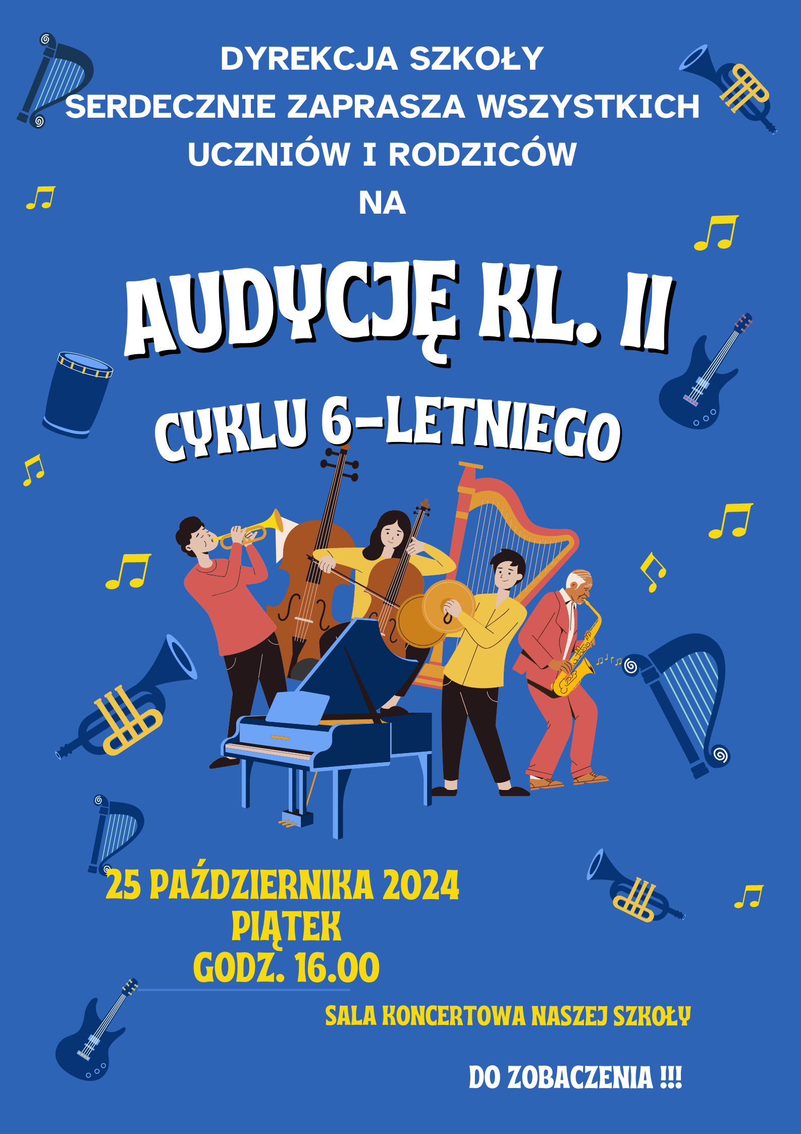 Plakat koloru niebieskiego, pośrodku rysunek grupy ludzi grających na instrumentach, białe napisy informujące o wydarzeniu