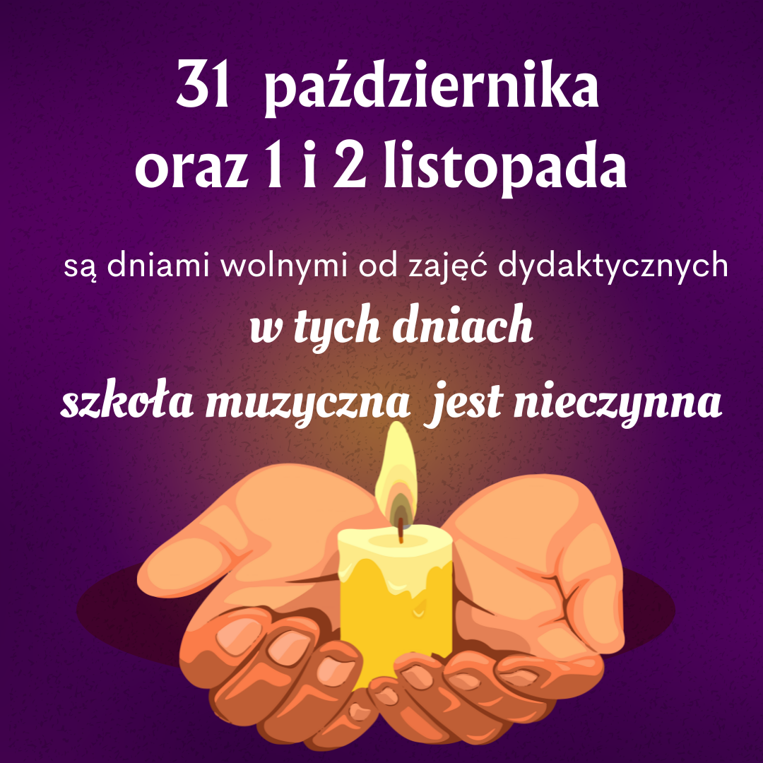 Fioletowe tło, rysunek dłoni trzymających świeczkę, białe napisy informujące o dniach wolnych