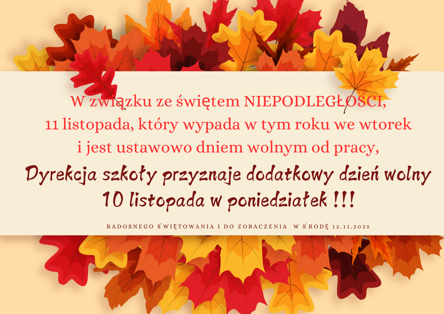 Plakat z rysunkami liści w kolorach jesiennych - pomarańczowe, żółte, brązowe. Napisy brązowe