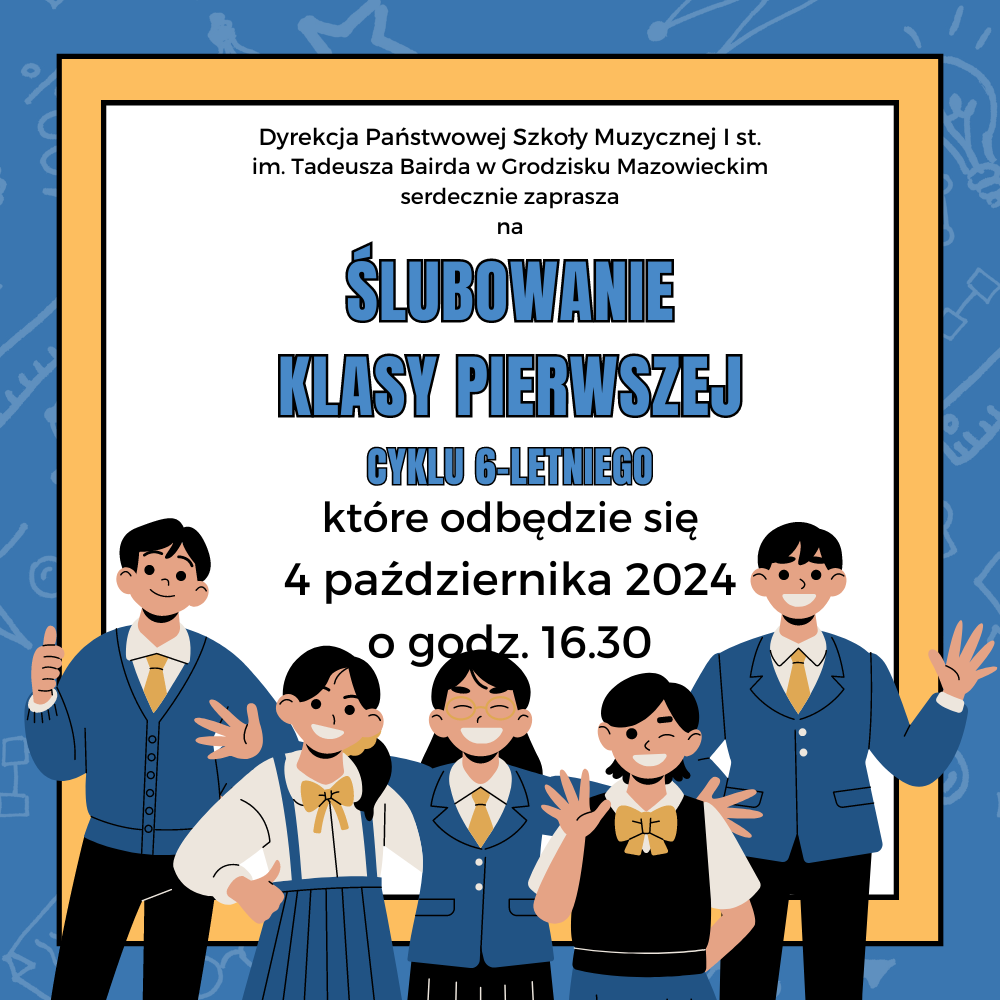 plakat z niebiesko - żółtą ramką, rysunek dzieci ubranych w mundurki i czarne i niebieskie napisy informujące o wydarzeniu