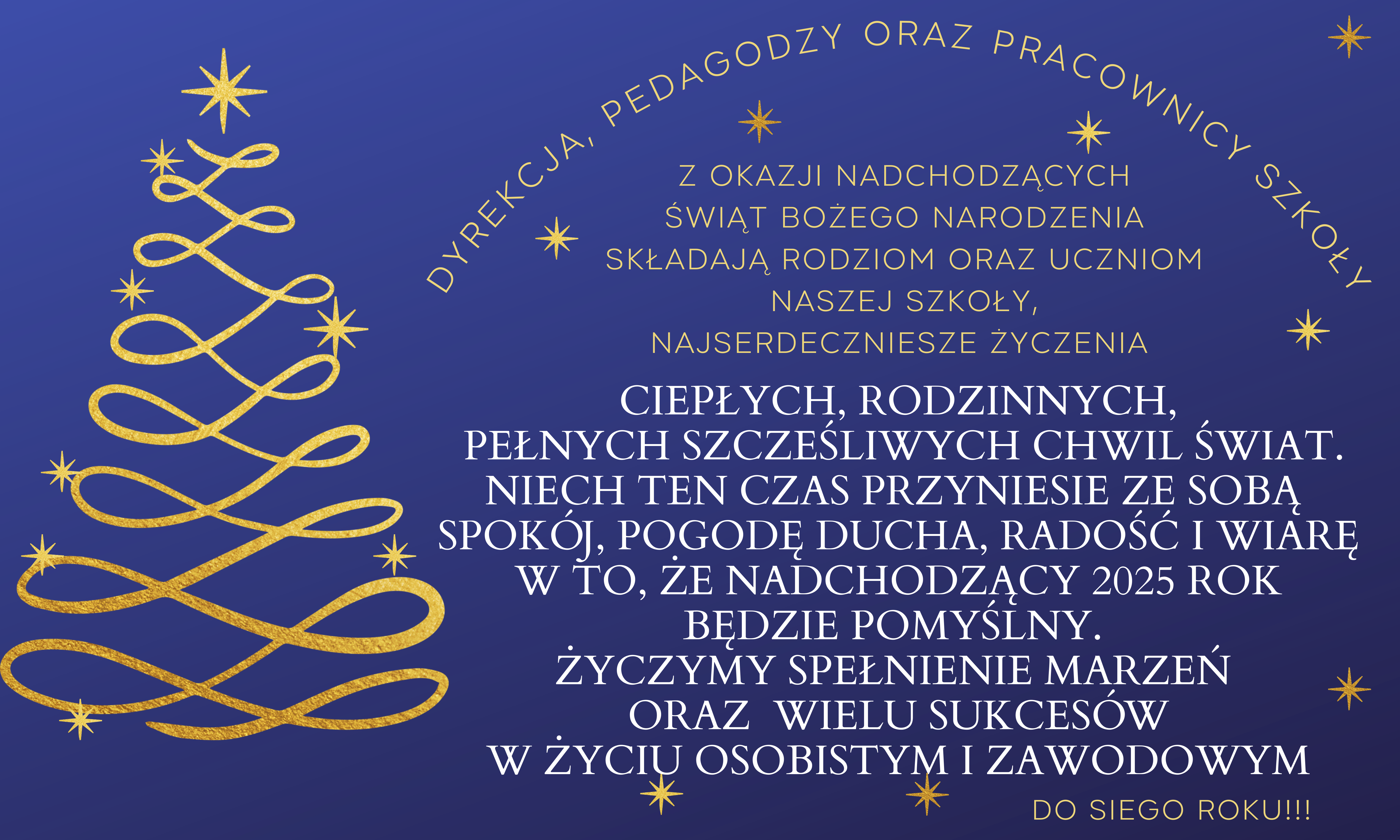 Granatowy plakat, złota choinka, białe napisy z życzeniami