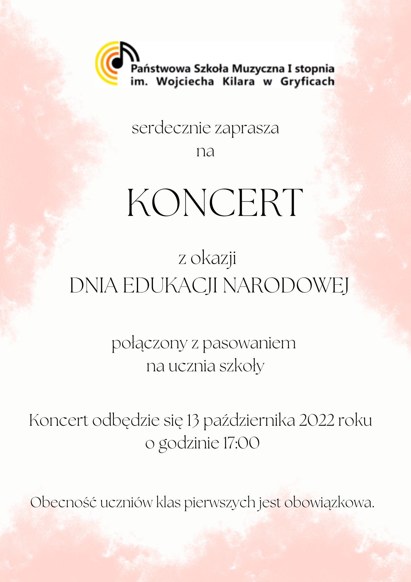 Serdecznie zapraszamy na Koncert z okazji Dnia Edukacji Narodowej połączony z pasowaniem na ucznia szkoły. Koncert odbędzie się 13 października 2022 roku o godzinie 17:00. Obecność uczniów klas pierwszych jest obowiązkowa.