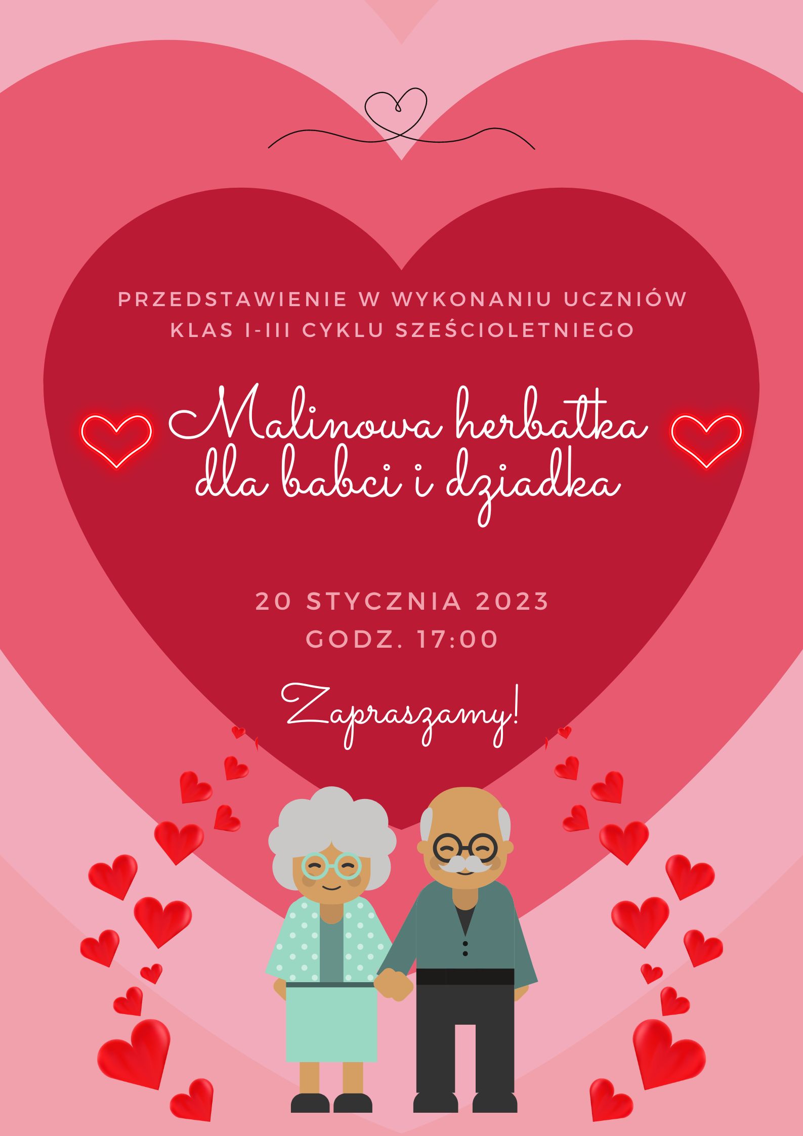 Szanowne Babcie! Szanowni Dziadkowie! Z okazji Waszego święta chcemy podziękować Wam za Waszą bezgraniczną miłość. Zapraszamy Was na prezentację naszych zespołowych umiejętności ruchu scenicznego, śpiewu i gry na instrumentach. Po części artystycznej zapraszamy na słodki poczęstunek z malinową herbatką w roli głównej. Piątek 20 stycznia godz. 17:00 - to nasz czas!