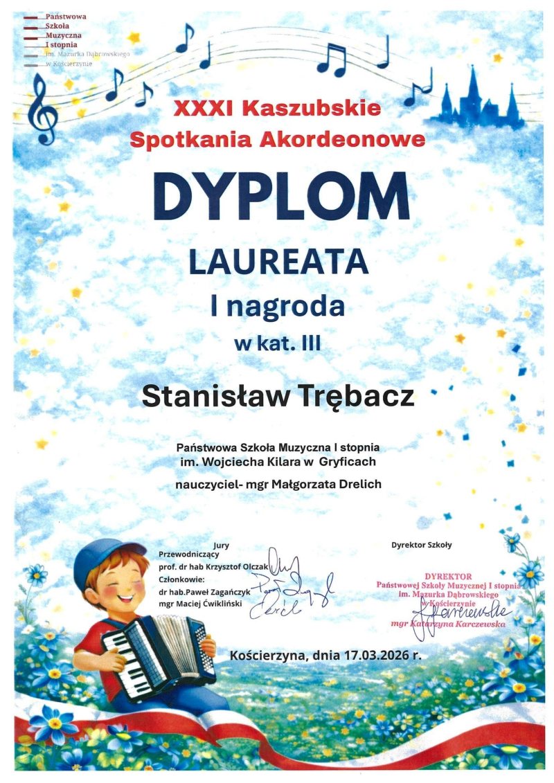 17 marca w PSM I i II stopnia w Kościerzynie w szranki XXXI Kaszubskich Spotkań Akordeonowych stanęło 53 solistów i 4 zespoły. Stanisław Trębacz z klasy IV/6 akordeonu Pani Małgorzaty Drelich zajął I miejsce. Gratulacje!!! Dodatkową atrakcją była wizyta w kościerskim muzeum akordeonu.