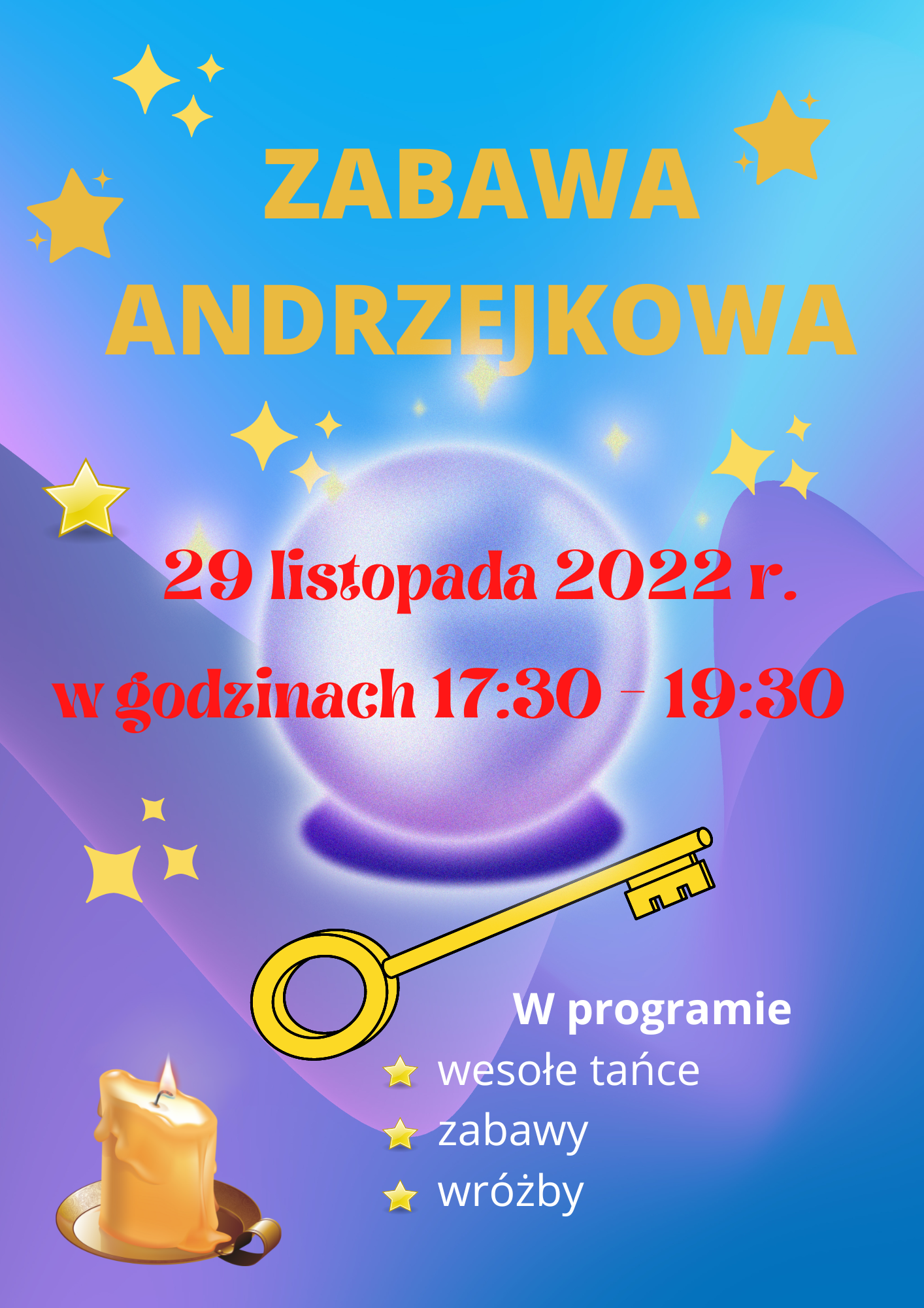 Zapraszamy wszystkich uczniów na zabawę andrzejkową, która odbędzie się 29 listopada 2022 r. (wtorek) w godzinach 17:30 - 19:30. W programie: wesołe tańce, zabawy i wróżby oraz słodki poczęstunek.