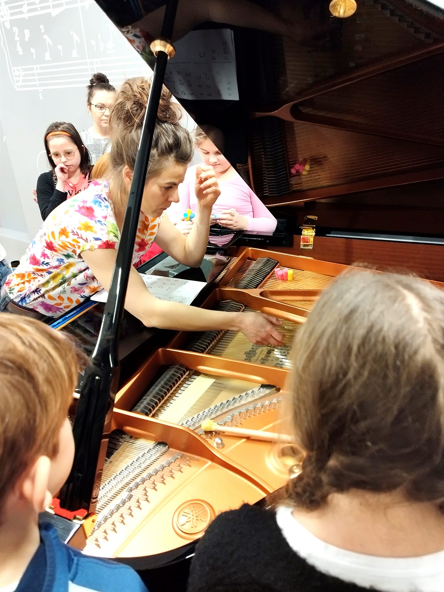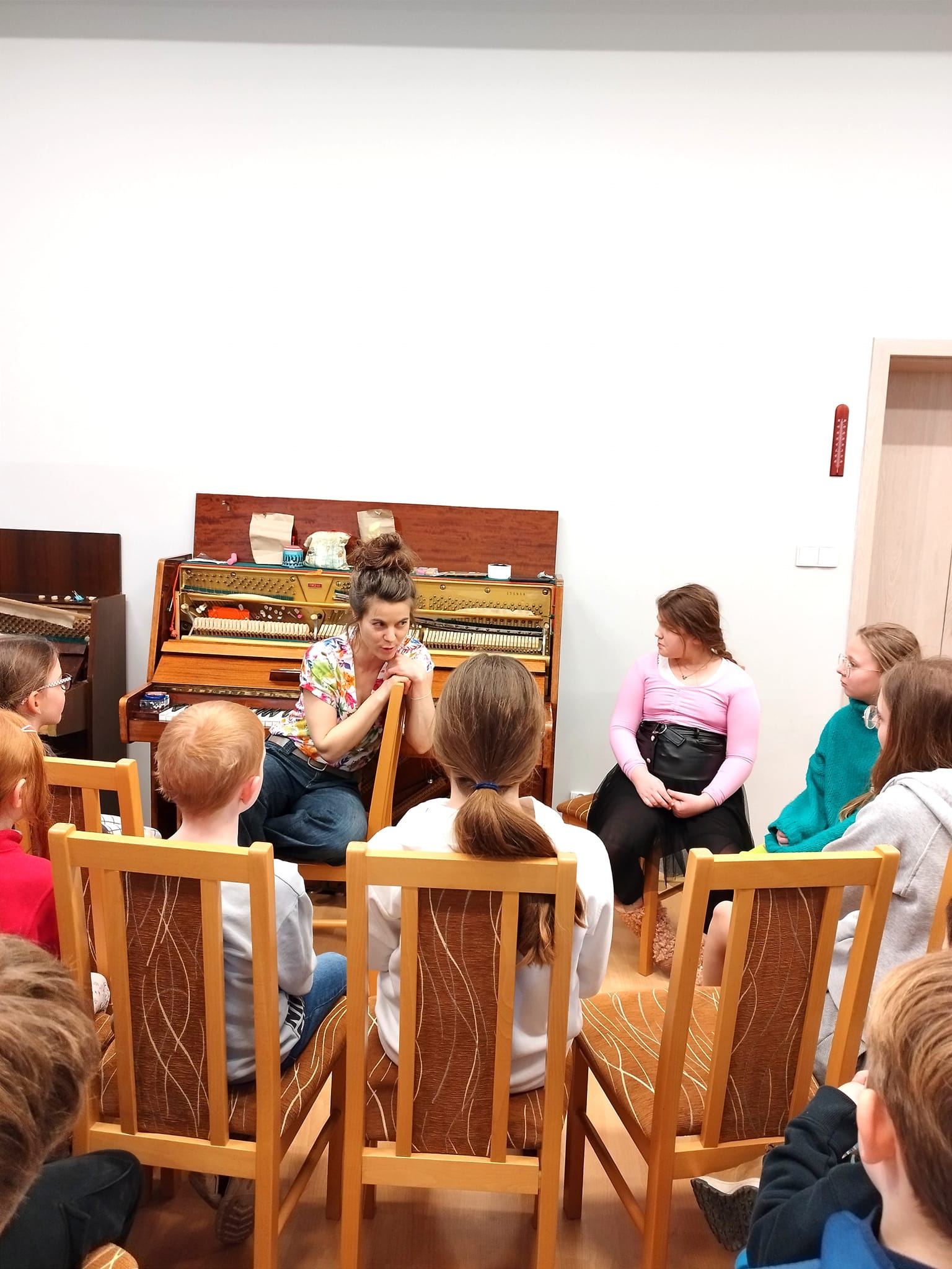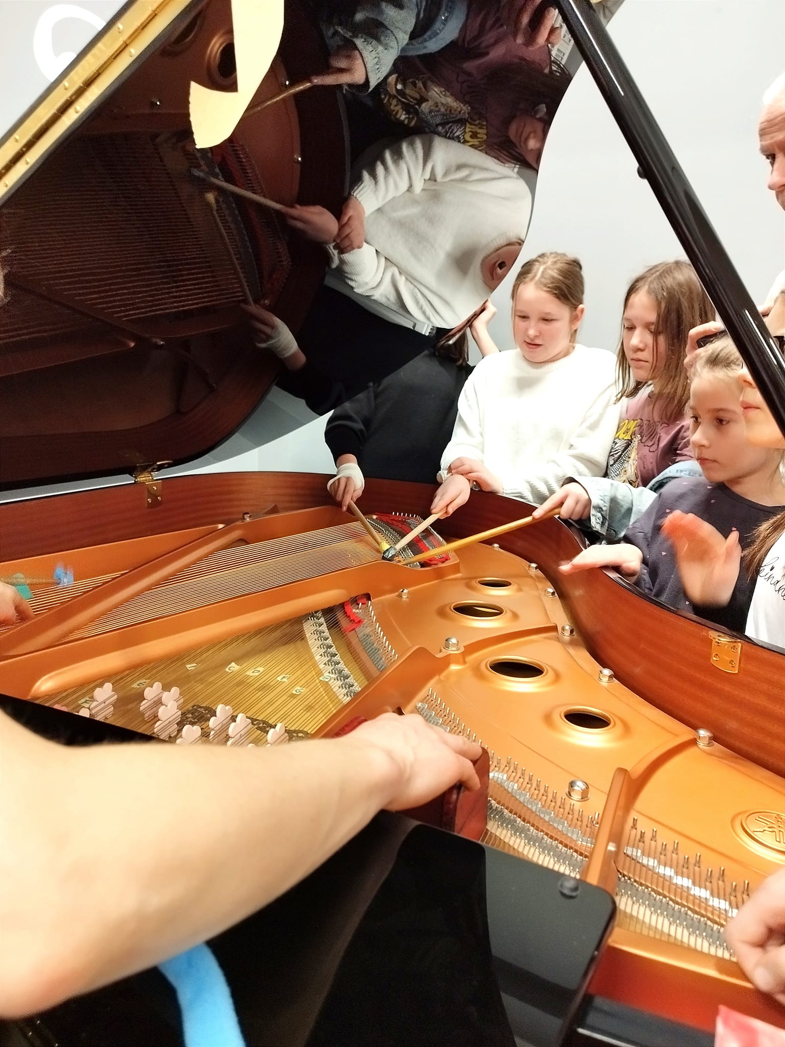 W dniu 8 marca 2023 roku dzięki współpracy z Gubińskim Domem Kultury i szerokim kontaktom jego dyrektora Andrzeja Winiszewskiego mieliśmy absolutnie wyjątkiwy event, warsztaty kreatywne na pianinie i fortepianie preparowanym prowadzone przez Barbarę Drazkov. Muzyka powinna oddziaływać na emocje i wyobraźnię i właśnie tego uczyli się nasi uczniowie. Wyobraźnia nie ma granic, trzeba tylko znaleźć sposób, żeby przekazać co nam w duszy gra. Barbara Drazkov spędziła długie godziny, żeby spreparować pianino, zaprezentowała jego możliwości. Drugie pianino już preparowali uczestnicy warsztatów pod czujnym okiem prowadzącej, która tłumaczyła co i po co oraz co wolno a czego absolutnie nie. W tej zabawie świetnie czuli się również skrzypkowie, fleciści, klarnecisci. Muzyka stała się pojęciem uniwersalnym ograniczonym tylko wyobraźnią ![]()
