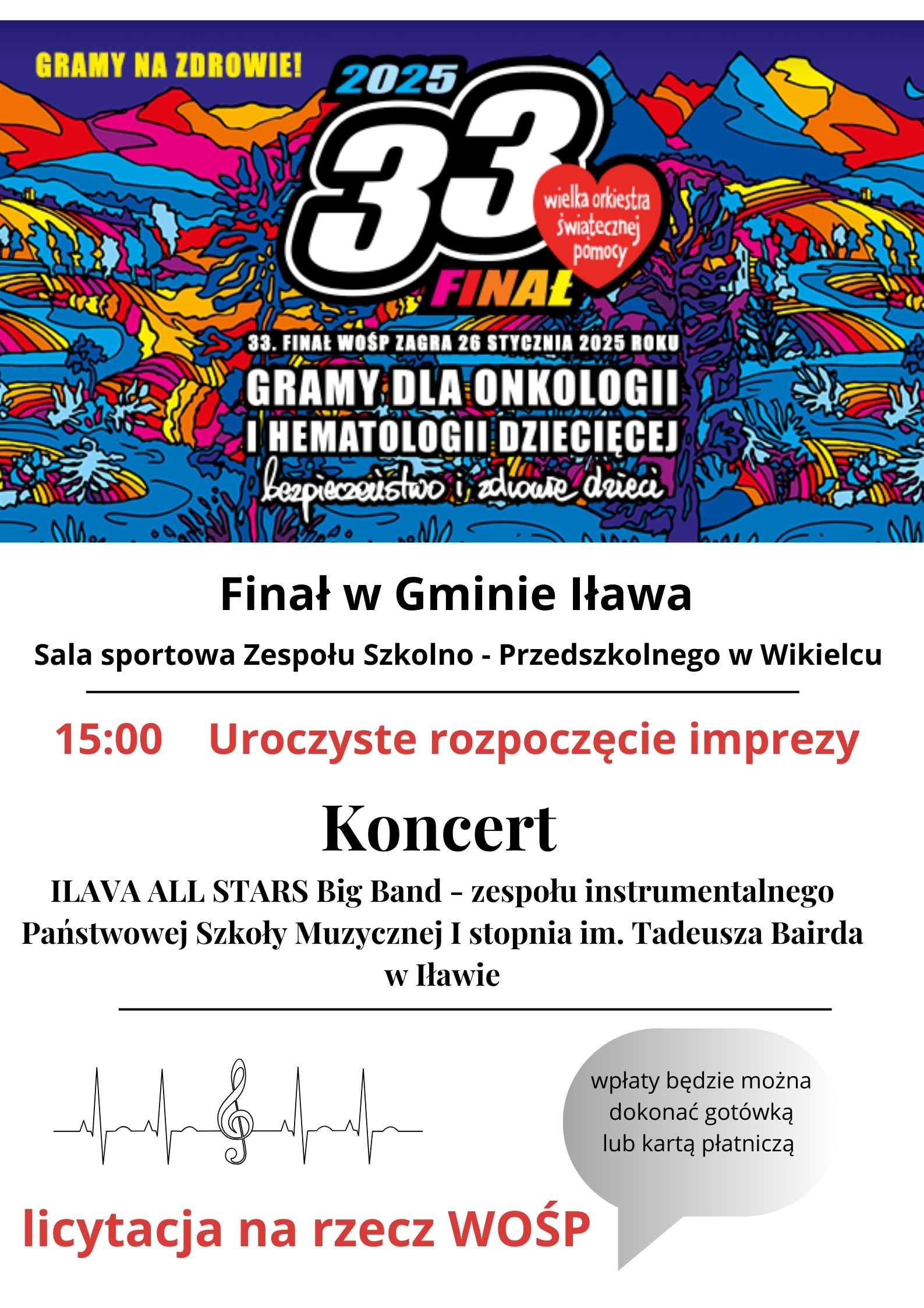 Zapraszamy na 33 Finał Wielkiej Orkiestry Świątecznej Pomocy w Gminie Iława Sala sportowa Zespołu Szkolno - Przedszkolnego w Wikielcu godzina 15:00
