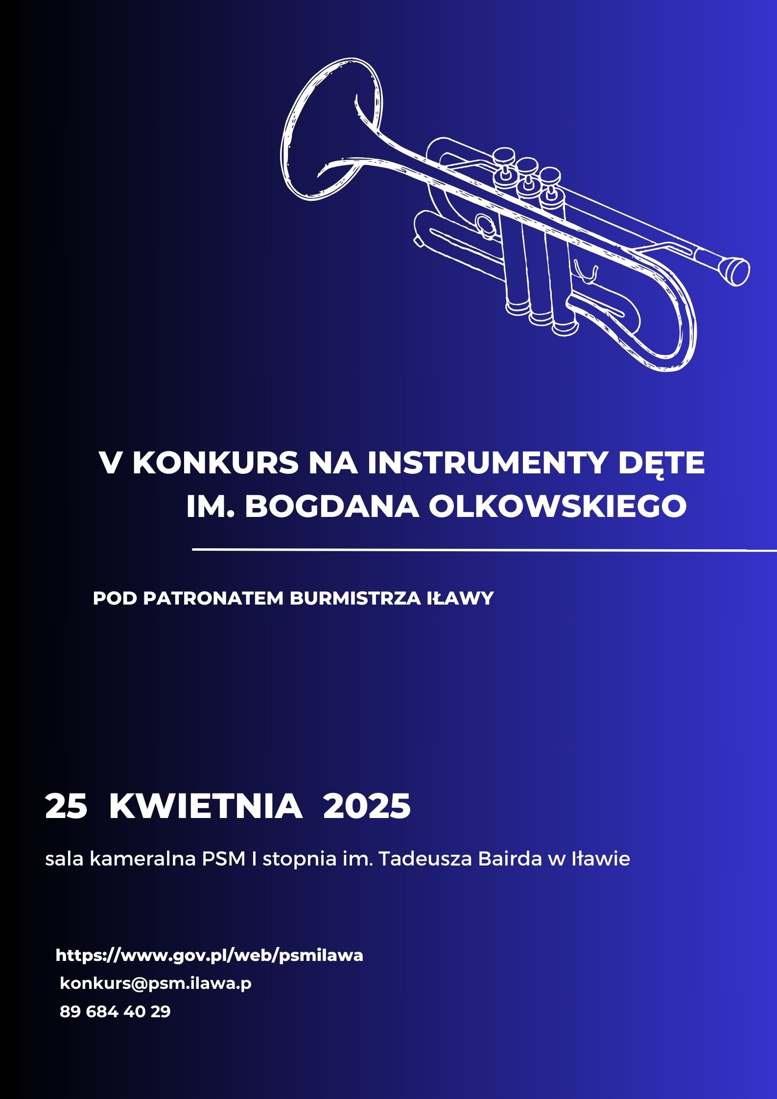 Państwowa Szkoła Muzyczna I stopnia im. Tadeusza Bairda w Iławie zaprasza na "V Konkurs na Instrumenty Dęte im. Bogdana Olkowskiego" w dniu 25 kwietnia 2025 r.