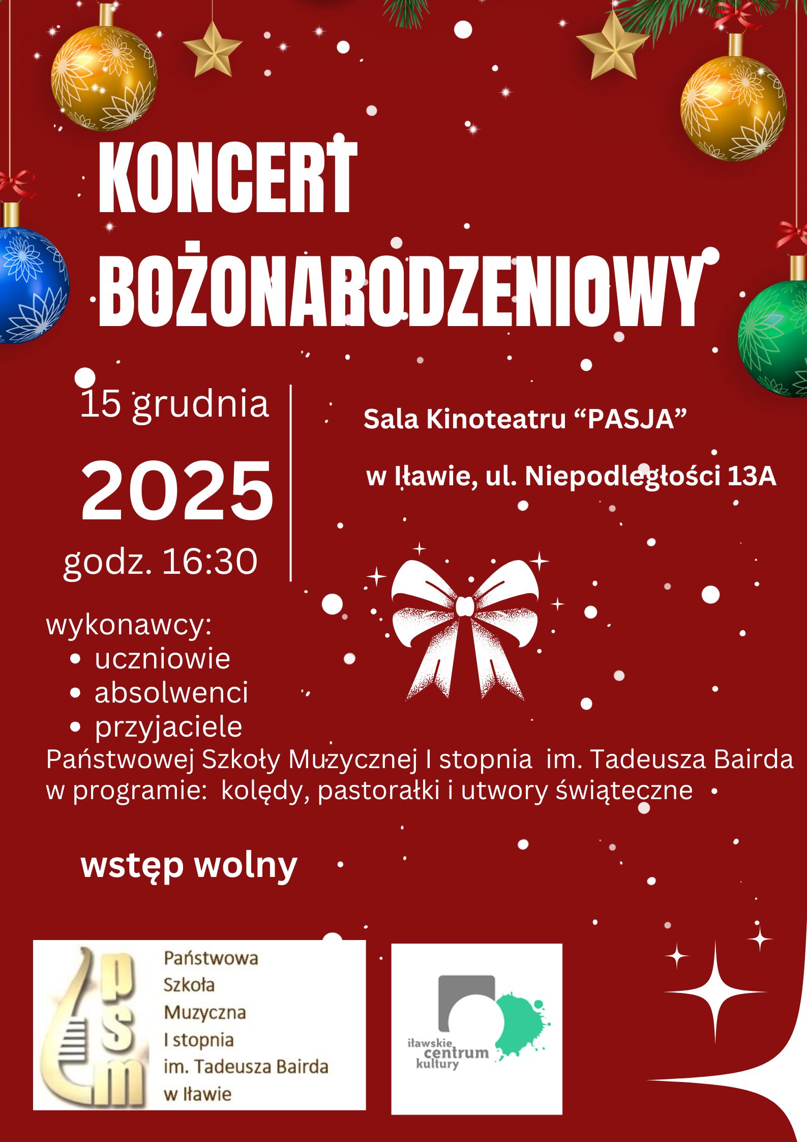 Zapraszamy na wyjątkowy Koncert Bożonarodzeniowy w wykonaniu: uczniów, absolwentów i przyjaciół Państwowej Szkoły Muzycznej I stopnia im. Tadeusza Bairda w Iławie. W programie najpiękniejsze koledy i utwory świateczne. Koncert odbędzie sie w dniu 15 grudnia 2025 r. o godz. 16:30 w sali Kinoteatru PASJA w Iławie, ul. Niepodległości 13A.