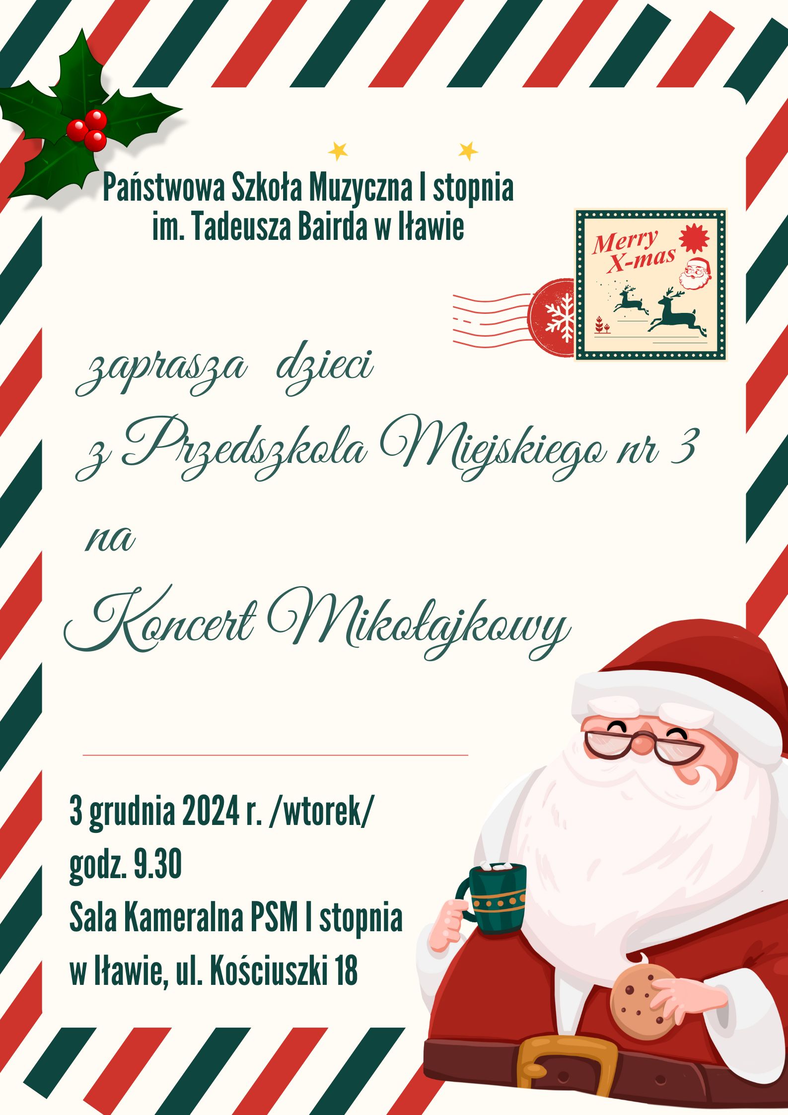 Uczniowie Państwowej Szkołu Muzycznej I stopnia im. Tadeusza Bairda zapraszają dzieci z Przedszkola Miejskiego nr 3 w Iławie na Koncert Mikołajkowy w sali Kameralnej PSM I stopnia im. Tadeusza Bairda w Iławie ul. Kościuszki 18 na godzine 9:30. W repertuaże kolędy, pastorałki, utwory Świąteczne i niespodzianka.
