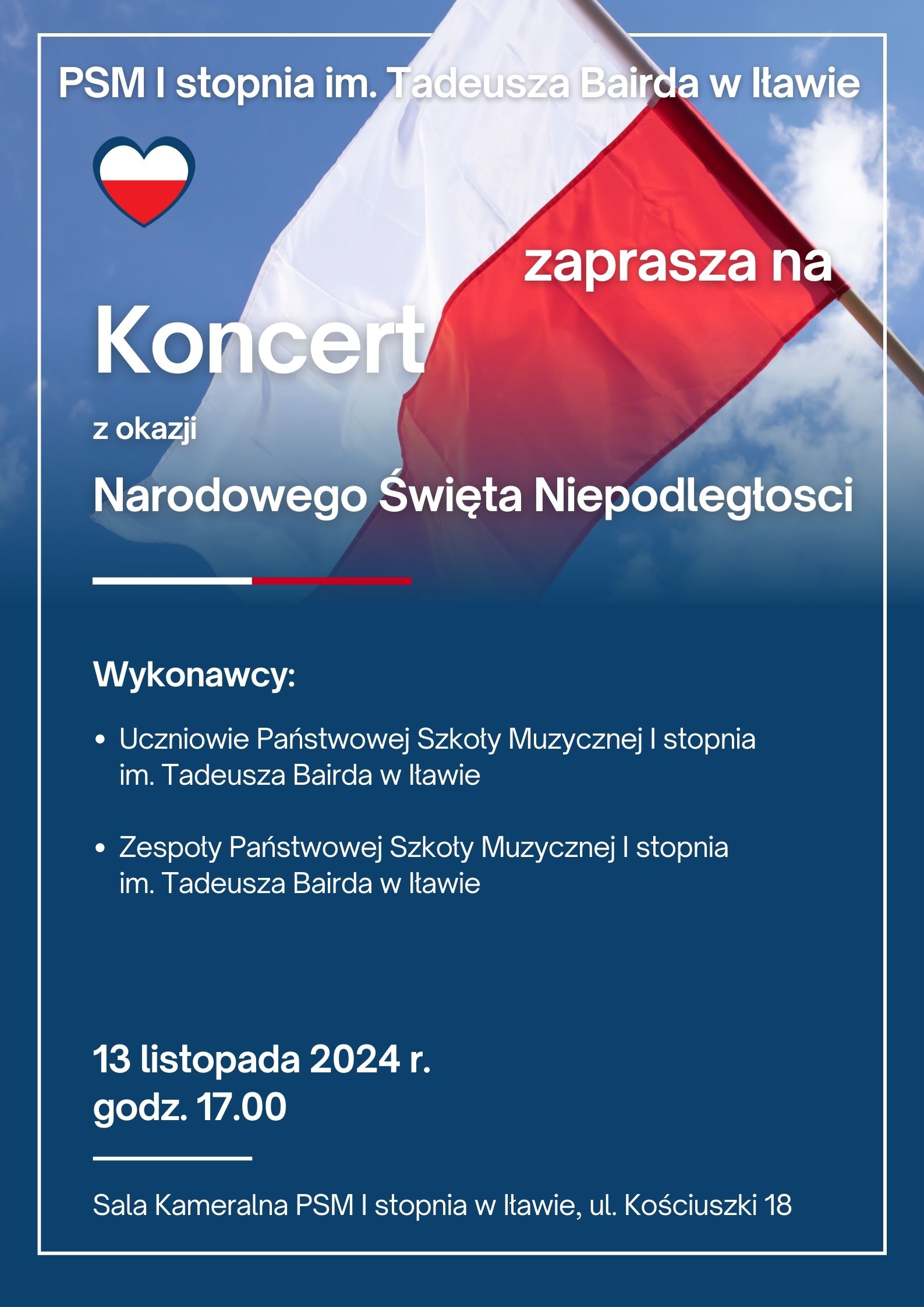 Plakat informacyjny o treści Państwowa Szkoła Muzyczna pierwszego stopnia im. Tadeusza Bairda w Iławie zaprasza na Koncert z okazji Narodowego Święta Niepodległości w dniu trzynastego listopada dwa tysiące dwudziestego czwartego roku na godzinę siedemnasta do sali kameralnej szkoły przy ulicy Kościuszki osiemnaście w wykonaniu uczniów i zespołów szkoły muzycznej w kolorze białym na niebieskim tle z grafiką flagi polski