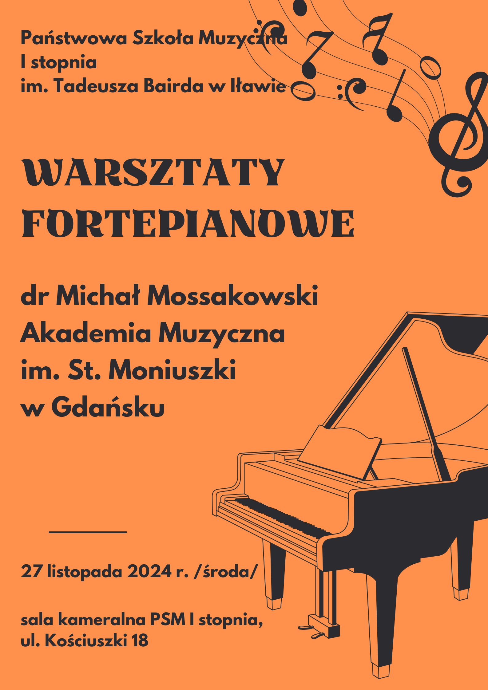 Plakat informujący o warsztatach fortepianowych prowadzonych przez dr Michała Mossakowskiego z Akademii Muzycznej im. Stanisława Moniuszki w Gdańsku w dniu dwudziestego siódmego listopada dwa tysiące dwudziestego czwartego roku w sali kameralnej szkoły w kolorze czarnym na pomarańczowym tle z grafiką fortepianu
