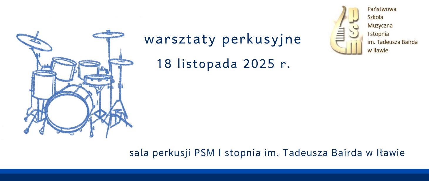 Zapraszamy na Warsztaty perkusyjne, które poprowadzi mgr Jakub Waszczuk. Warsztaty odbędą się w dniu 18 listopada 2025 r. w sali perkusji Państwowej Szkoły Muzycznej I stopnia im. Tadeusza Bairda w Iławie, ul. Kościuszki 18