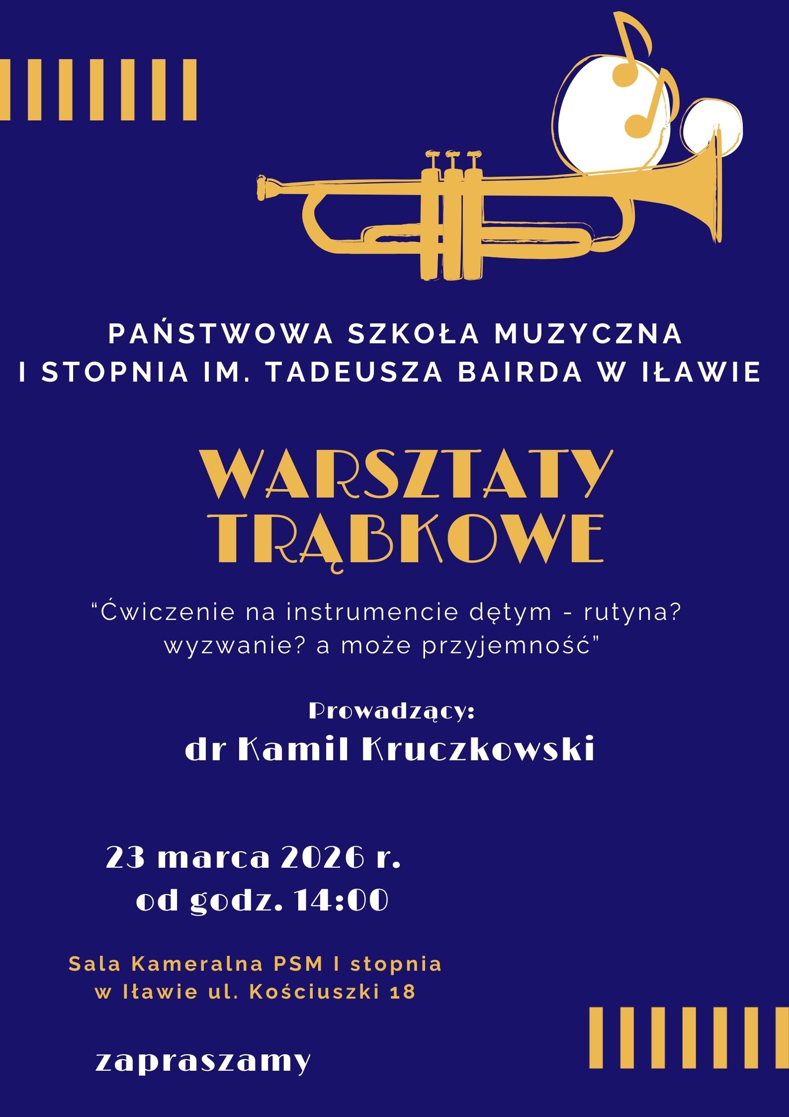 Dyrektor Państwowej Szkoły Muzycznej I stopnia im. Tadeusza Bairda w Iławie zaprasza na Warsztaty trąbkowe "Ćwiczenie na instrumencie dętym - rutyna? wyzwanie? a może przygoda ?". Warsztaty odbędą się w Sali Kameralnej PSM I stopnia w Iławie ul. Kościuszki 18 w dniu 23 marca 2026 r. od godz. 14:00. Peowadzący dr Kamil Kruczkowski z Akademii Muzycznej im. Stanisława Moniuszki w Gdańsku. Zapraszamy