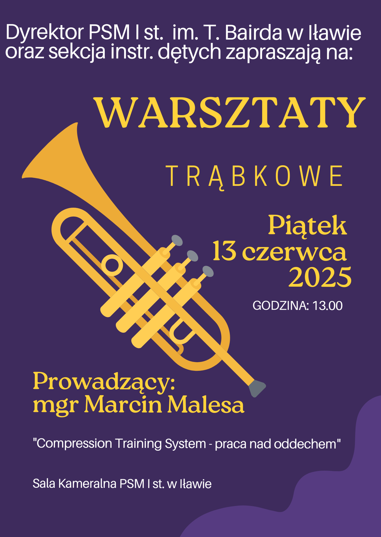 Plakat z napisem Dyrektor PSM pierwszego stopnia im. Tadeusza Bairda w Iławie oraz sekcja instrumentów dętych zapraszają na warsztaty trąbkowe w piątek trzynastego czerwca dwa tysiące dwudziestego piątego godzina trzynasta prowadzone przez mgr Marcina Malesa sala kameralna PSM I stopnia w Iławie w kolorze żółtym i białym z grafiką trąbki w kolorze żółtym na fioletowym tle