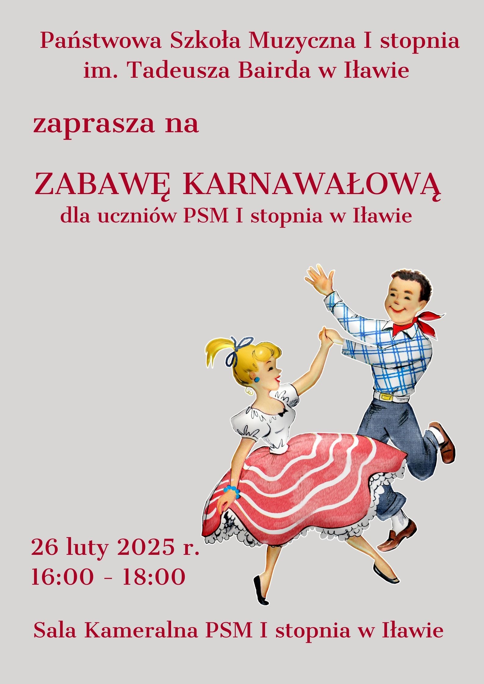 Plakat z informacją Państwowa Szkoła Muzyczna pierwszego stopnia im. Tadeusza Bairda w Iławie zaprasza na zabawę karnawałową uczniów PSM pierwszego stopnia w Iławie w dniu dwudziestego szóstego lutego w godzinach szesnasta osiemnasta w sali kameralnej szkoły w kolorze czerwonym na szarym tle z grafika tańczącej pary - dziewczynka w białej bluzce i czerwonej spódnice, chłopiec w białej koszuli w kratkę i niebieskich spodniach