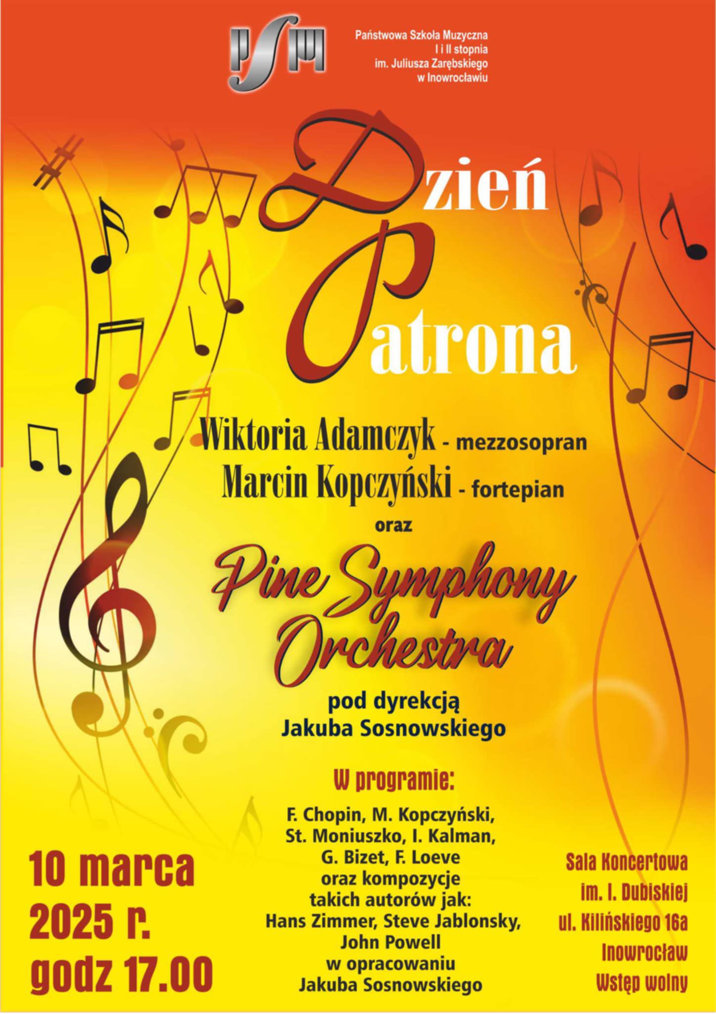 10.03.2024 o godz. 17.00 zapraszamy na specjalny Koncert z okazji Dnia Patrona Państwowa Szkoła Muzyczna I i II stopnia w Inowrocławiu! Wystąpią - utalentowana śpiewaczka Wiktoria Adamczyk i Marcin Kopczyński - fortepian oraz Pine Symphony Orchestra (w jej składzie uczniowie, nauczyciele i absolwenci) z filmowymi aranżacjami i pod dyr. naszego absolwenta Jakub Sosnowski! W programie m.in. Moniuszko, Chopin, Bizet, Kalman, Kopczyński oraz kompozytorzy muzyki filmowej - Zimmer, Jablonsky i Powell. Zapraszamy! Wstęp wolny!