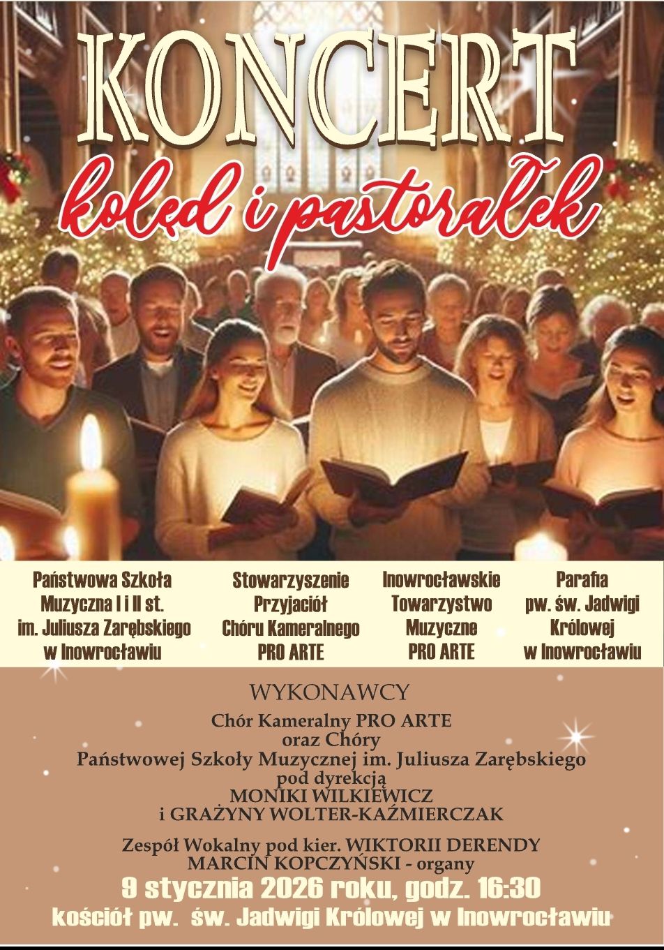 W piątek 9.01.2026 o godz. 16.30 zapraszamy do kościoła p.w św. Jadwigi Królowej w Inowrocławiu na koncert kolęd i pastorałek. Wystąpią chóry Państwowa Szkoła Muzyczna I i II stopnia w Inowrocławiu, Chór kameralny PRO ARTE pod dyrekcją Monika Wilkiewicz i Grażyna Wolter - Kaźmierczak oraz Zespół Wokalny pod kier. Wiktoria Derenda. Marcin Kopczyński - akompaniament. Wstęp wolny! Zapraszamy serdecznie na kolędowanie z muzyczną młodzieżą!