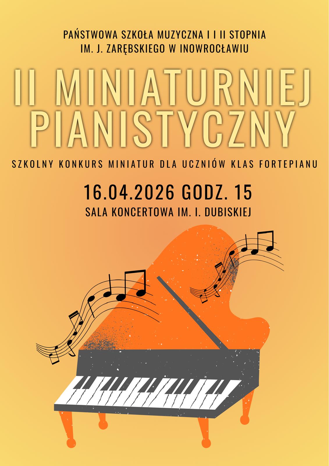W najbliższy czwartek, 16 kwietnia 2026 r., pianiści z klas II - VI cyklu sześcioletniego I st. oraz II - IV cyklu czteroletniego I st. zaprezentują się podczas szkolnego konkursu na miniaturę o nazwie „II Miniaturniej pianistyczny”. Przesłuchania konkursowe rozpoczną się o godzinie 15:00 w sali koncertowej im. I. Dubiskiej i będą otwarte dla publiczności. Ogłoszenie wyników nastąpi około godziny 18:30.