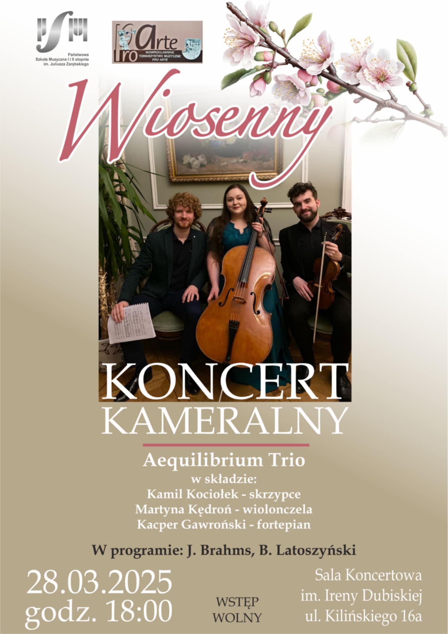 zapraszamy na wyjątkowy wieczór muzyki kameralnej, podczas którego zabrzmią dwa dzieła na fortepian, skrzypce i wiolonczelę – III Trio fortepianowe c-moll op. 101 Johannesa Brahmsa oraz II Trio fortepianowe Borysa Latoszyńskiego. Zagrają młodzi muzycy z Akademii Muzycznej w Bydgoszczy - Kacper Gawroński, Martyna Kędroń i Kamil Kociołek czyli Aequilibrium Trio.