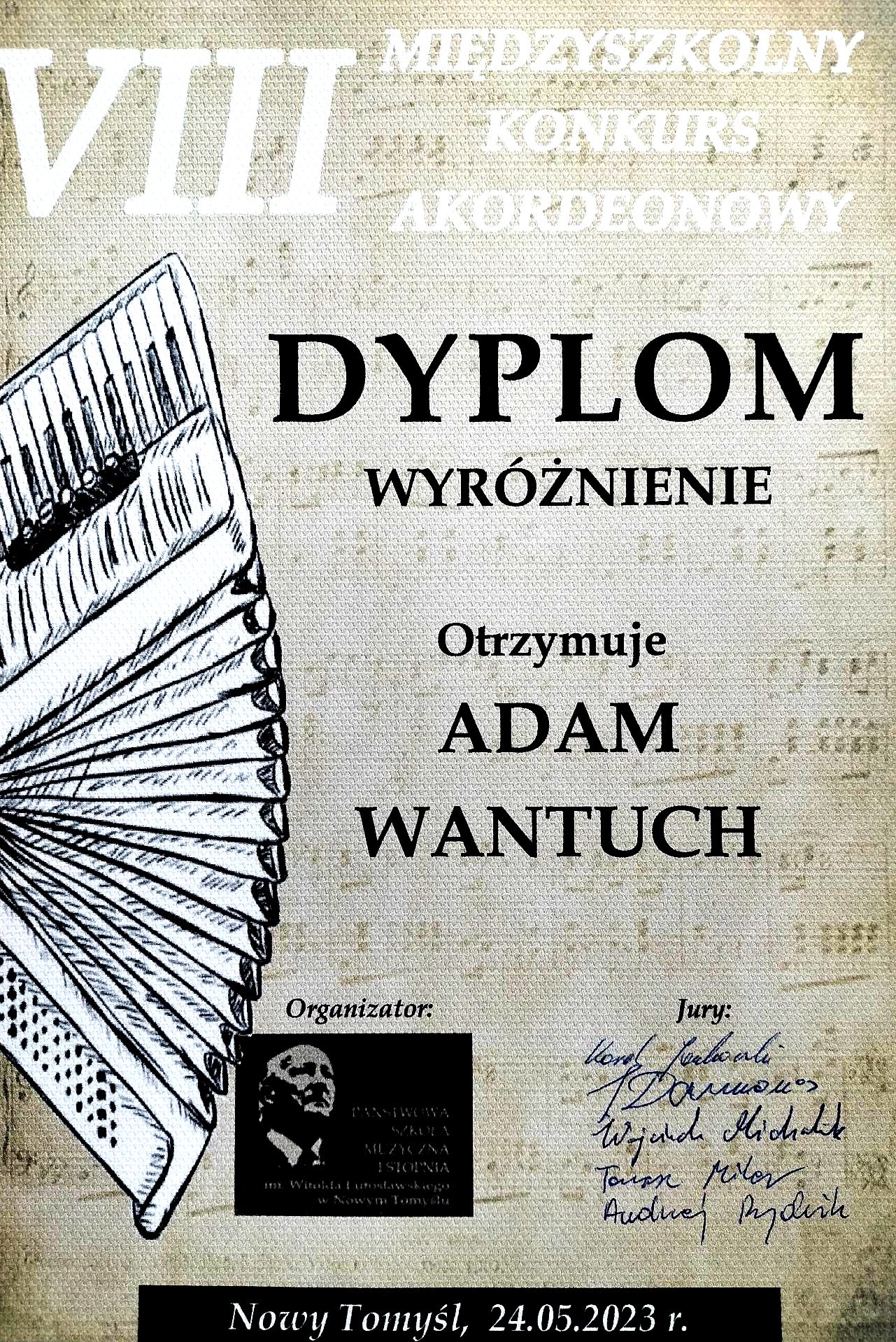 Z radością informujemy, że uczeń Adam Wantuch uzyskał wyróżnienie podczas VIII Międzyszkolnego Konkursu Akordeonowego.