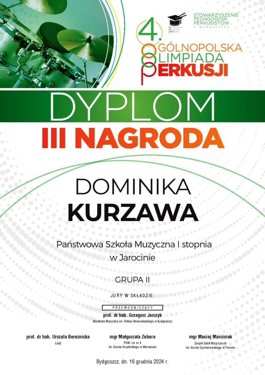 Dominika Kurzawa, uczennica Pana Łukasza Dąbrowskiego, zdobyła III nagrodę podczas 4. Ogólnopolskiej Olimpiady Perkusji, która odbywała się w dniu 16 grudnia 2024 roku w Bydgoszczy.