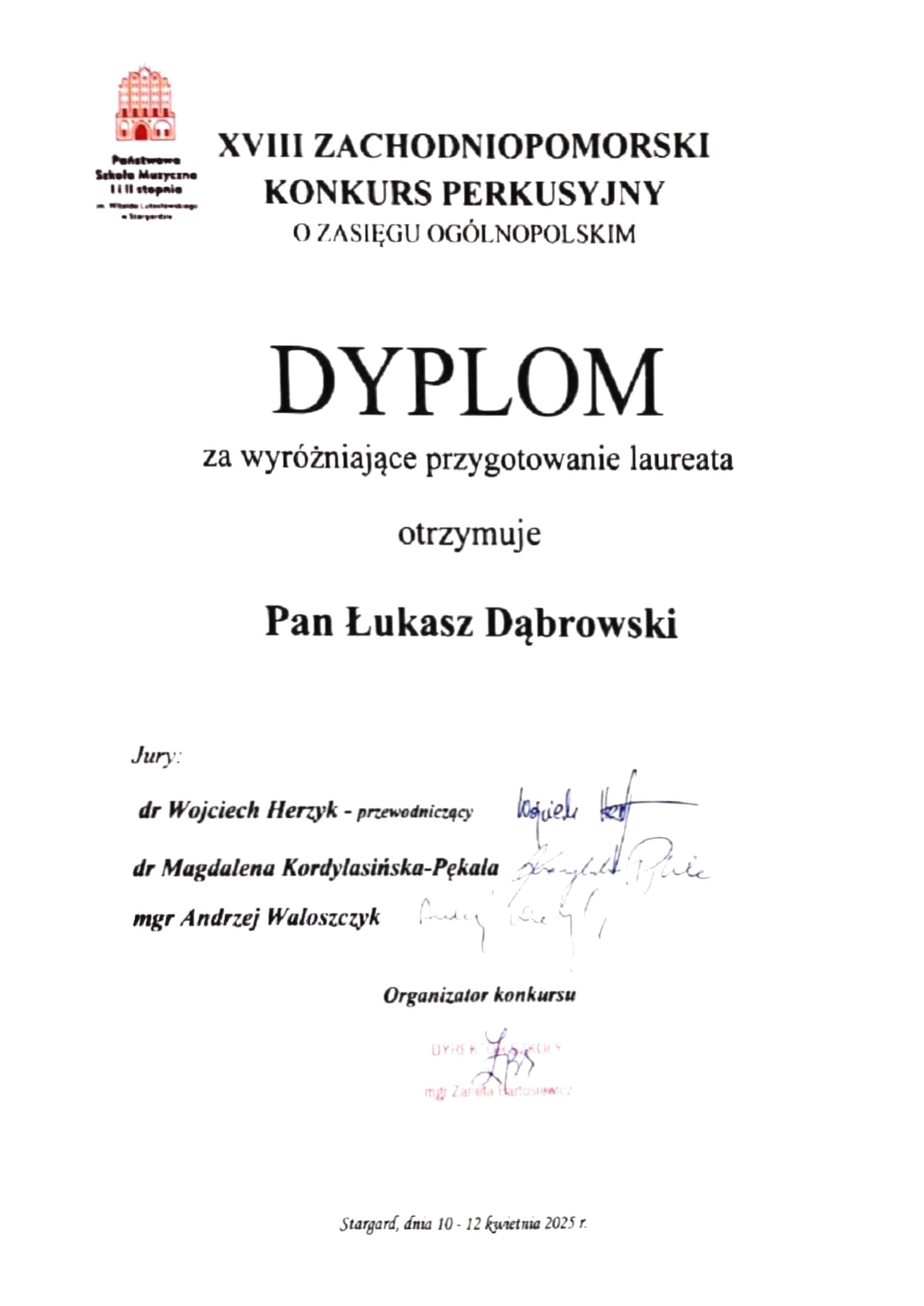 To wspaniałe osiągnięcie jest owocem jej ciężkiej pracy, talentu oraz zaangażowania. Opiekunem artystycznym Dominiki jest Łukasz Dąbrowski, nauczyciel klasy perkusji.