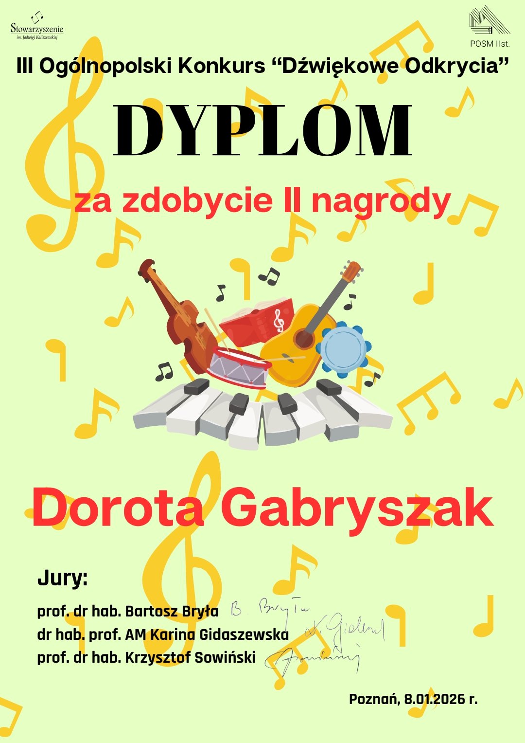 Z radością informujemy o znakomitym osiągnięciu Doroty Gabryszak, która zdobyła II nagrodę w III Ogólnopolskim Konkursie „Dźwiękowe Odkrycia”.