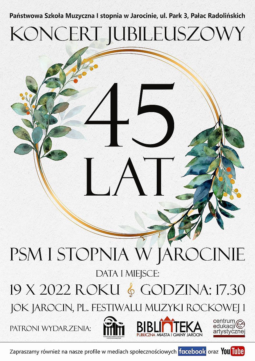 Uprzejmie informujemy, że w związku z obchodami Jubileuszu 45-lecia Państwowej Szkoły Muzycznej I stopnia w Jarocinie w dniu 19 października 2022 roku wszystkie zajęcia w szkole są zawieszone.