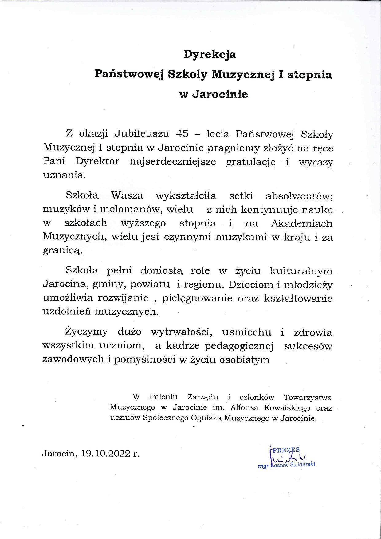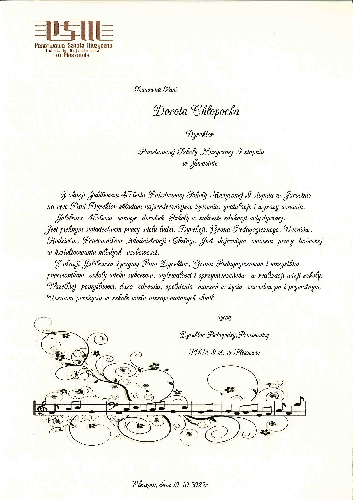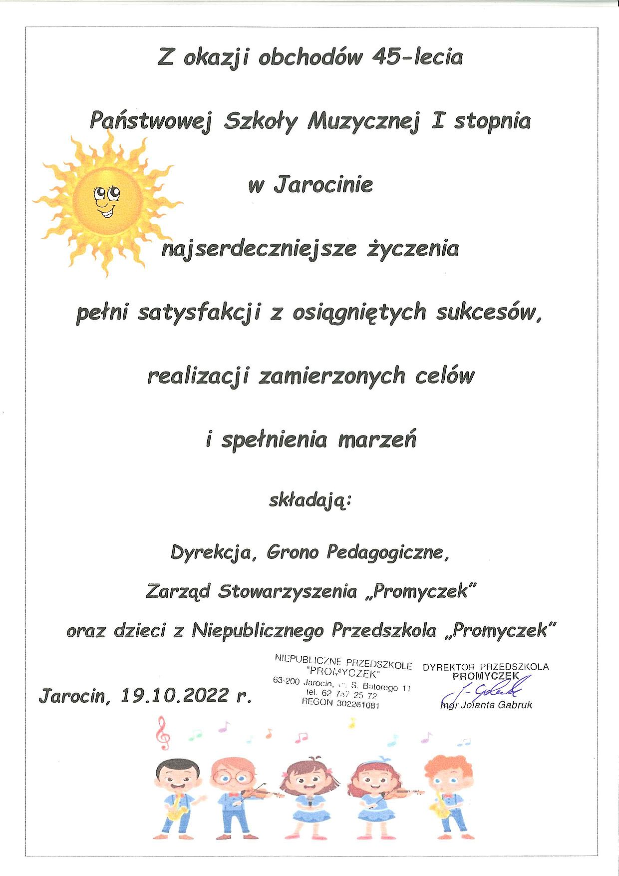 Czterdzieści pięć lat to kawał historii, czas podsumowań, wspomnień oraz mnóstwo małych i dużych sukcesów Uczniów, Absolwentów i Nauczycieli Naszej Szkoły. Wszystkim członkom społeczności szkolnej, za cały wkład i zaangażowanie w działalność Państwowej Szkoły Muzycznej I stopnia w Jarocinie składamy serdeczne podziękowania.