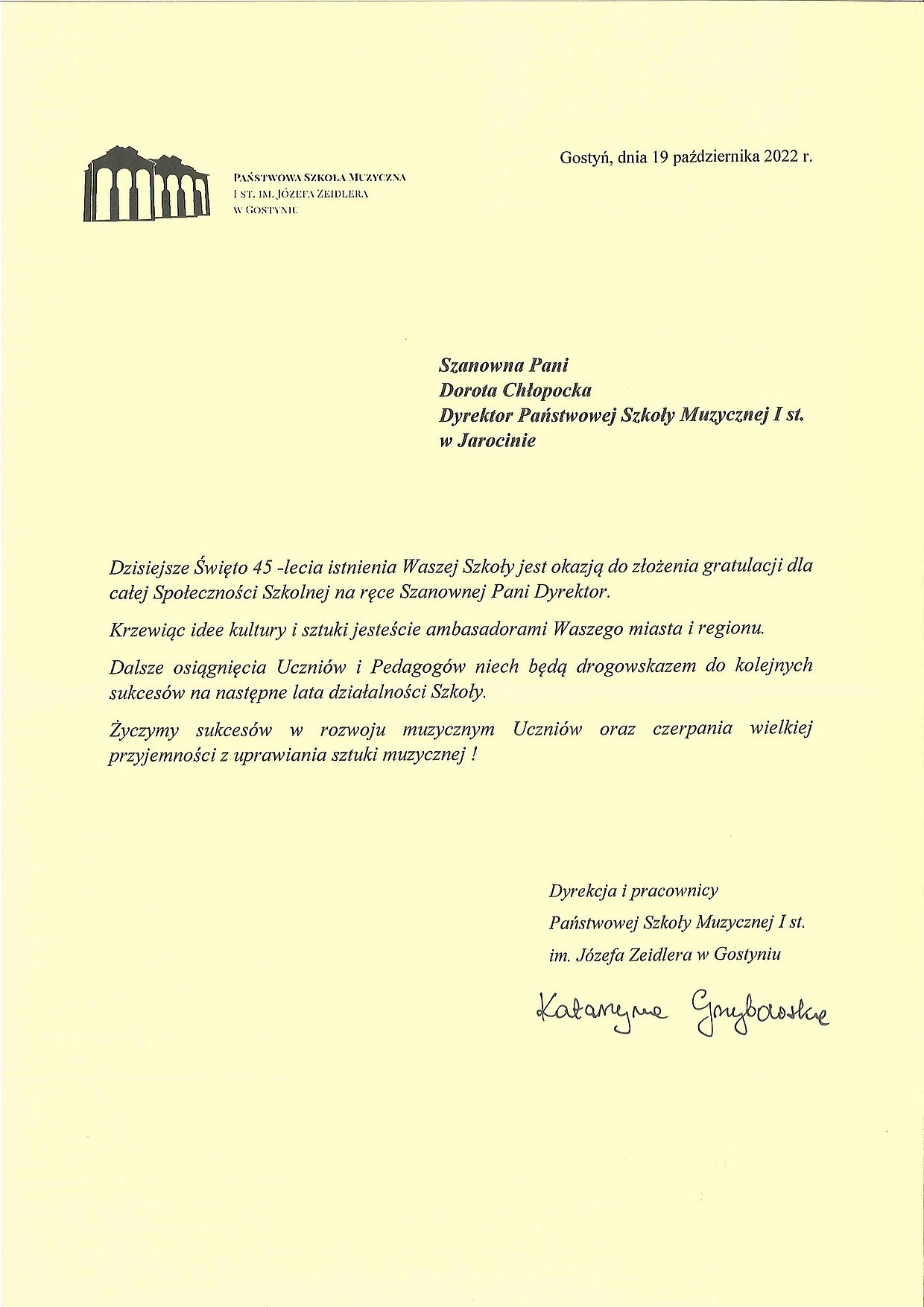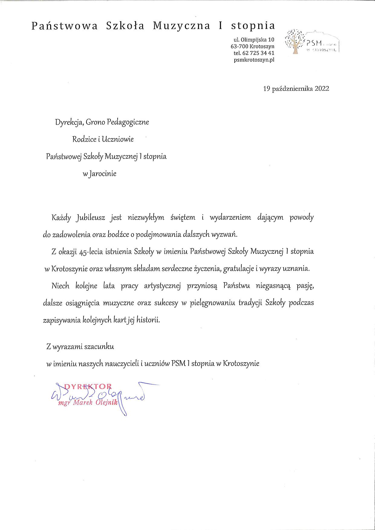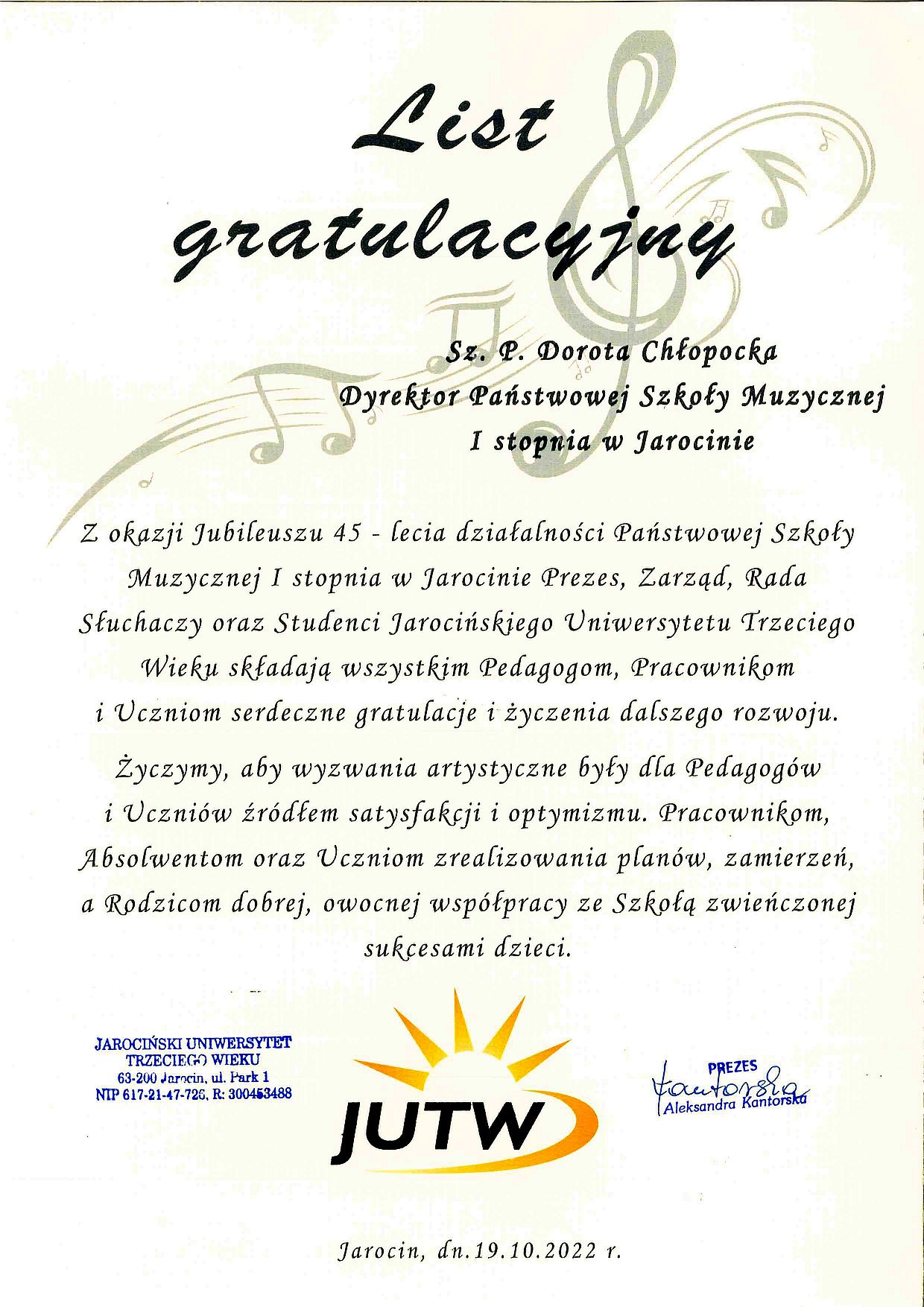 Czterdzieści pięć lat to kawał historii, czas podsumowań, wspomnień oraz mnóstwo małych i dużych sukcesów Uczniów, Absolwentów i Nauczycieli Naszej Szkoły. Wszystkim członkom społeczności szkolnej, za cały wkład i zaangażowanie w działalność Państwowej Szkoły Muzycznej I stopnia w Jarocinie składamy serdeczne podziękowania.
