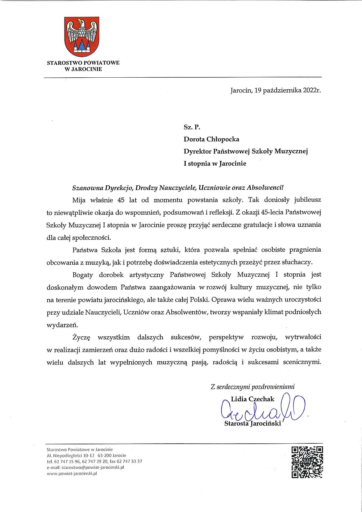 W dniu 19 października 2022 roku w Jarocińskim Ośrodku Kultury przy placu Festiwalu Muzyki Rockowej 1 odbył się uroczysty koncert z okazji Jubileuszu 45-lecia Państwowej Szkoły Muzycznej I stopnia w Jarocinie.