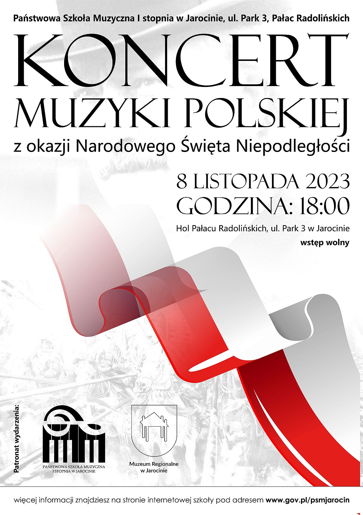 W dniu 8 listopada 2023 roku serdecznie zapraszamy na uroczysty koncert muzyki polskiej z okazji Narodowego Święta Niepodległości w wykonaniu uczniów, nauczycieli i absolwentów PSM I stopnia w Jarocinie.