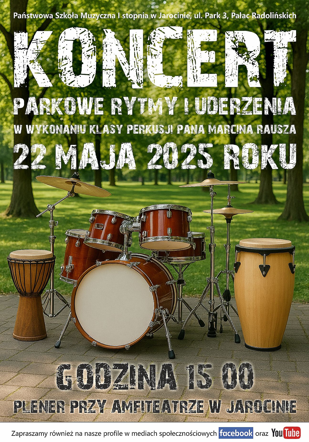 Jak co roku serdecznie zapraszamy na plenerowy koncert "Parkowe rytmy i uderzenia" w wykonaniu uczniów klasy perkusji Pana Marcina Rausza.