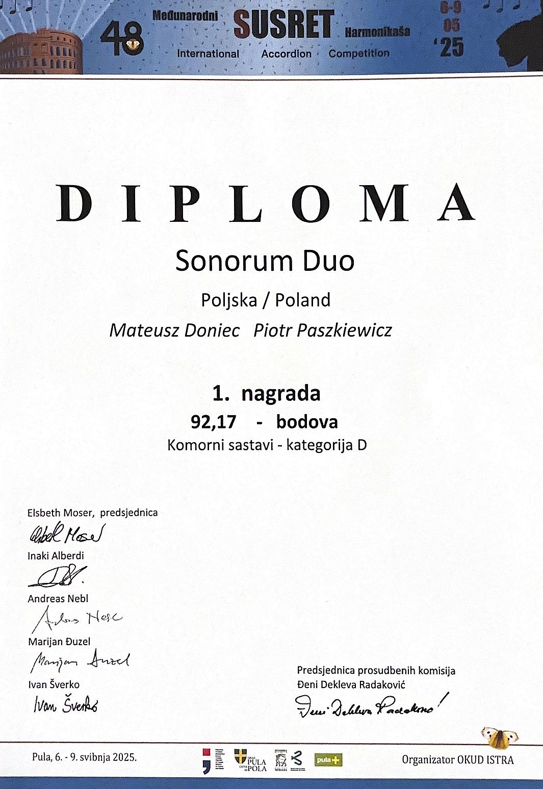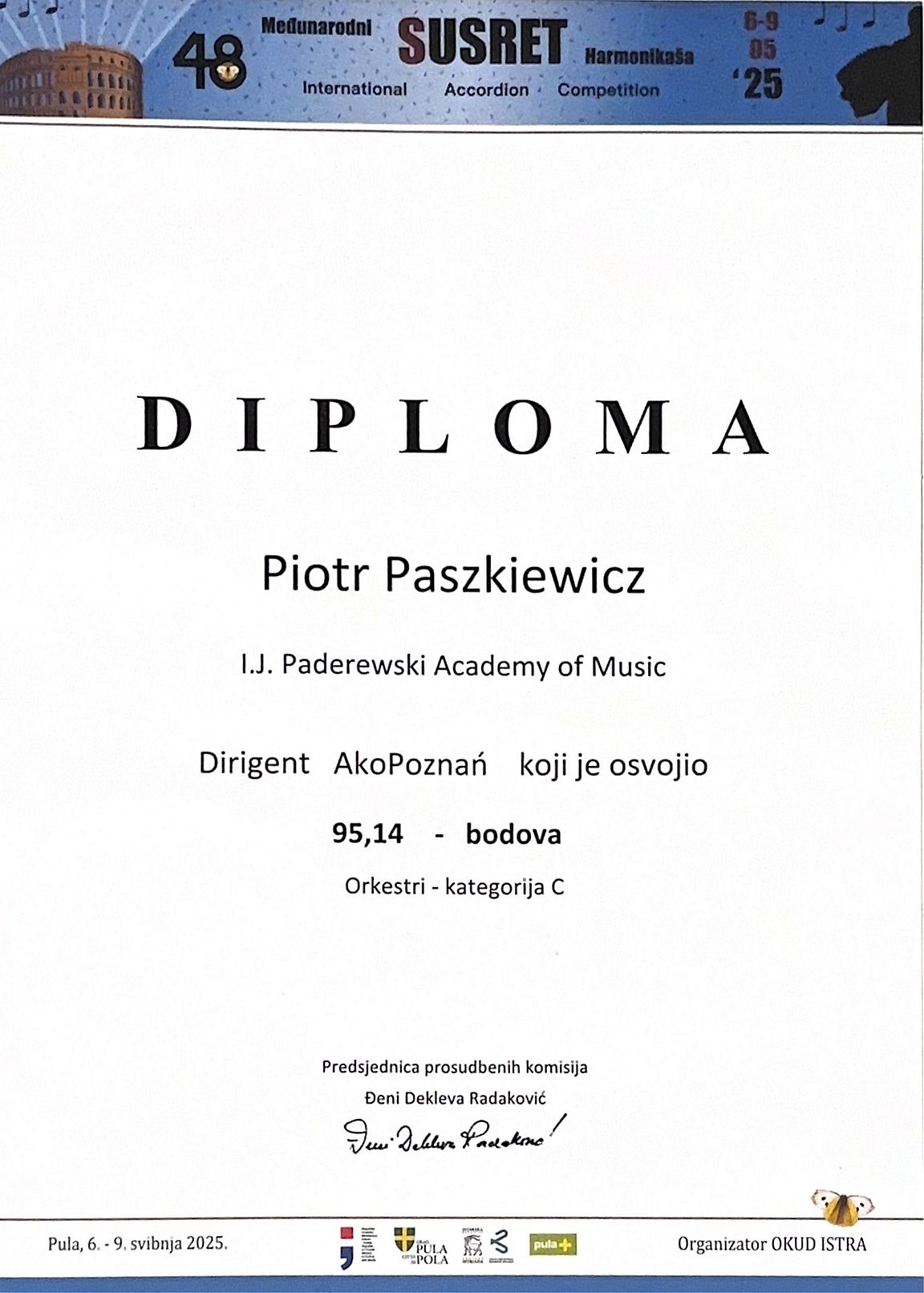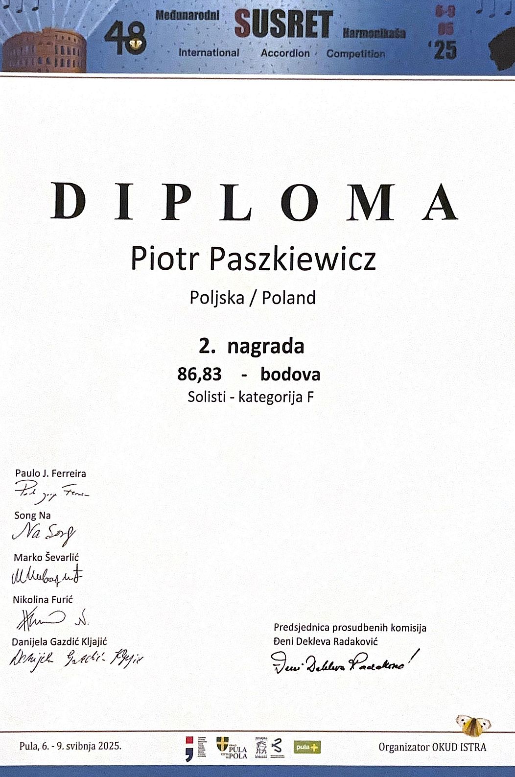 Z ogromną dumą informujemy, że podczas 48. Międzynarodowego Konkursu Akordeonowego w Puli (Chorwacja), który odbywał się w dniach 6–9 maja 2025 roku, nauczyciel naszej szkoły – Pan Piotr Paszkiewicz – odniósł spektakularny sukces, zdobywając nagrody w aż trzech kategoriach: