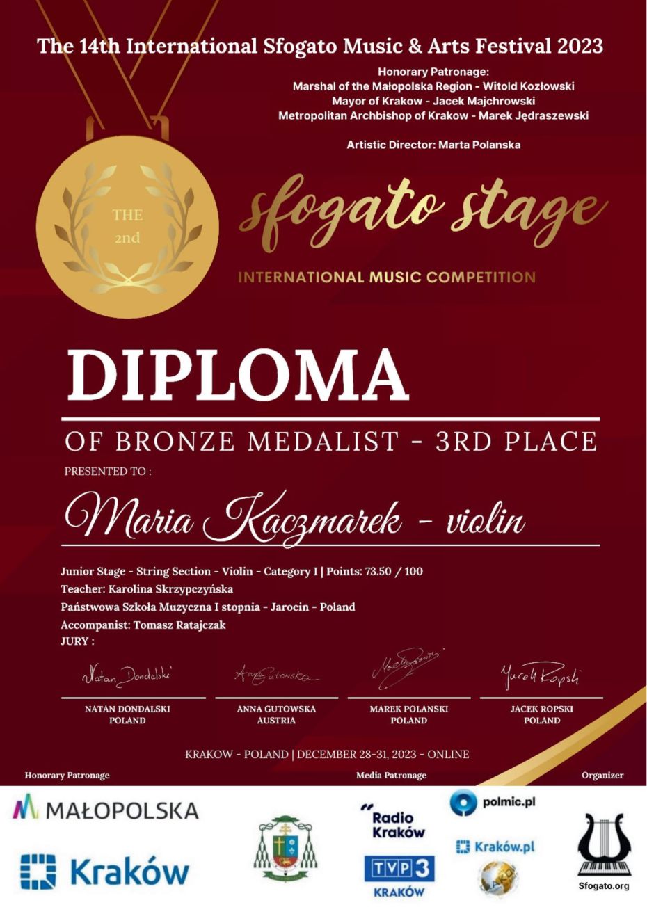 Podczas zmagań konkursowych 14. Międzynarodowego Konkursu Muzyki i Sztuki "Sfogato" w Krakowie, uczennica naszej szkoły zdobyła III miejsce (brązowy medal) w kategorii I (skrzypce).