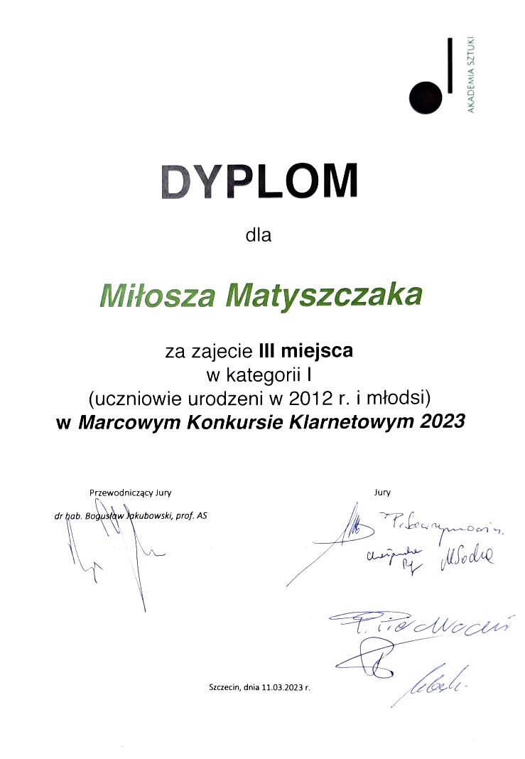 Sukces Miłosza Matyszczaka podczas Marcowego Konkursu Klarnetowego 2023 w Szczecinie